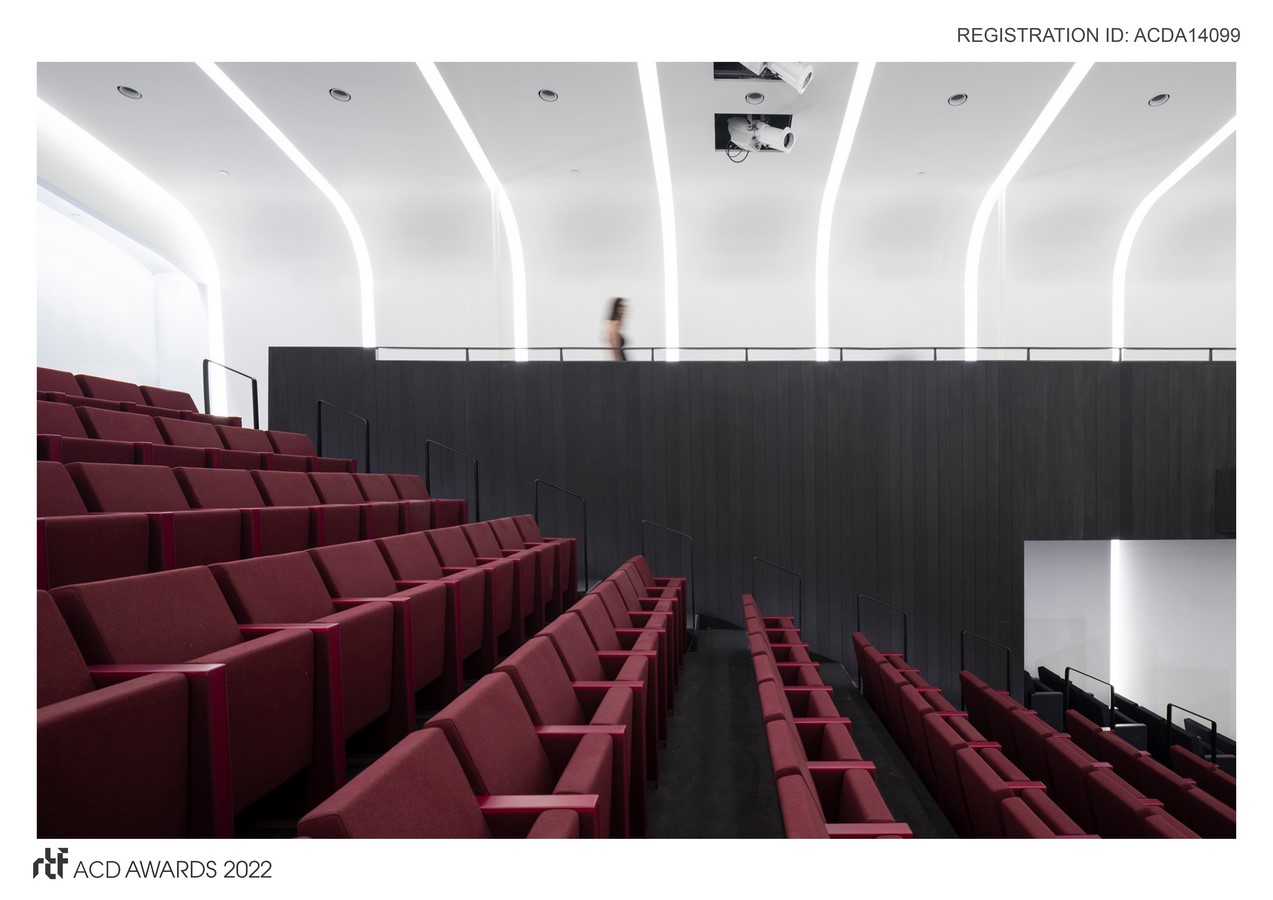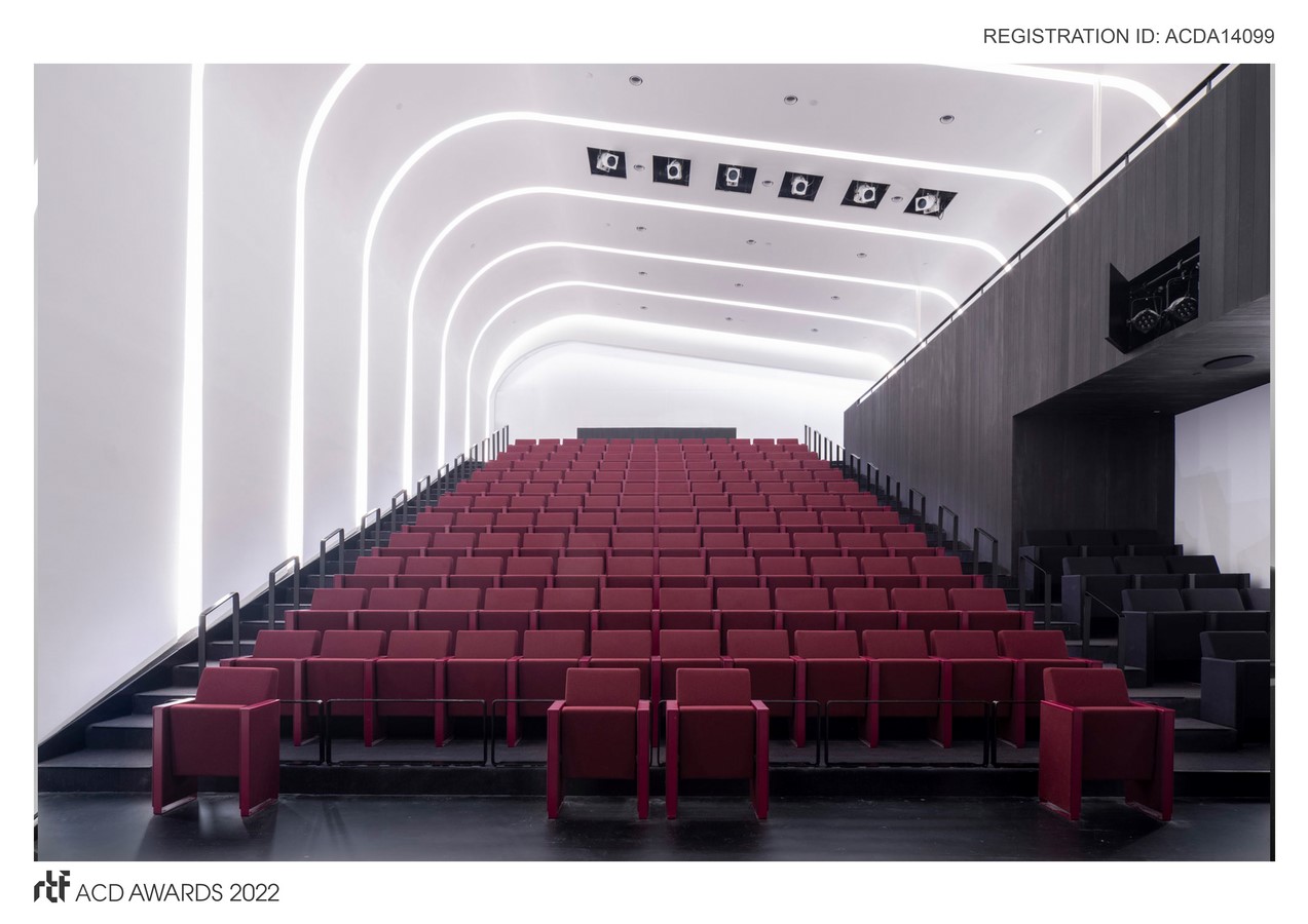 The raw shell remained unfinished for many years as no one had a solution to life safety issues that did not enable the required 180 seats. The museum wanted a space to capture the joyful spirit of the families they serve with a bold, practical, yet playful design. They asked for robust materiality and a mature, comfortable atmosphere to embrace the full latitude of the institution’s theatrical intentions for children’s programs, films, and lectures to varied constituencies. It’s not just for kids.