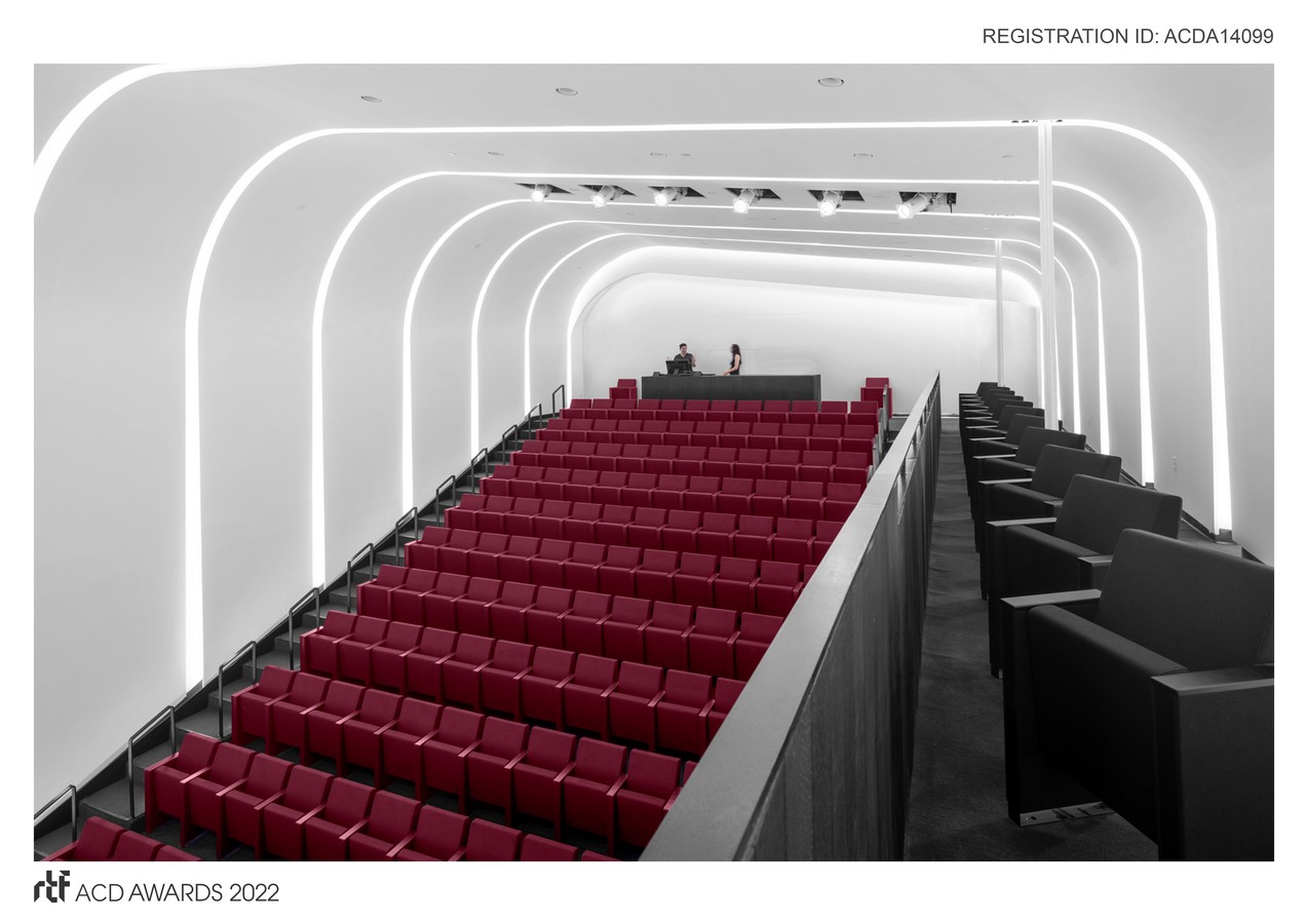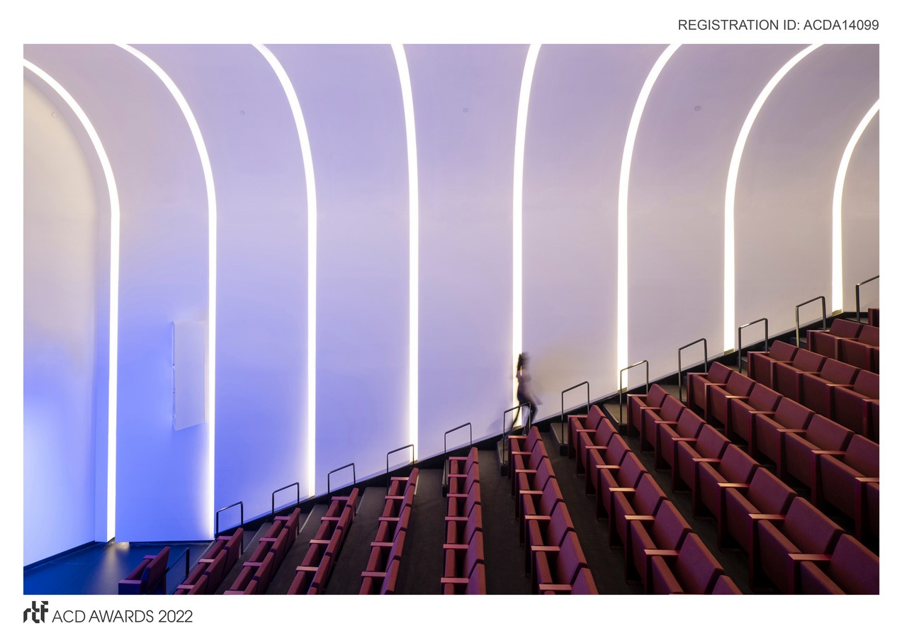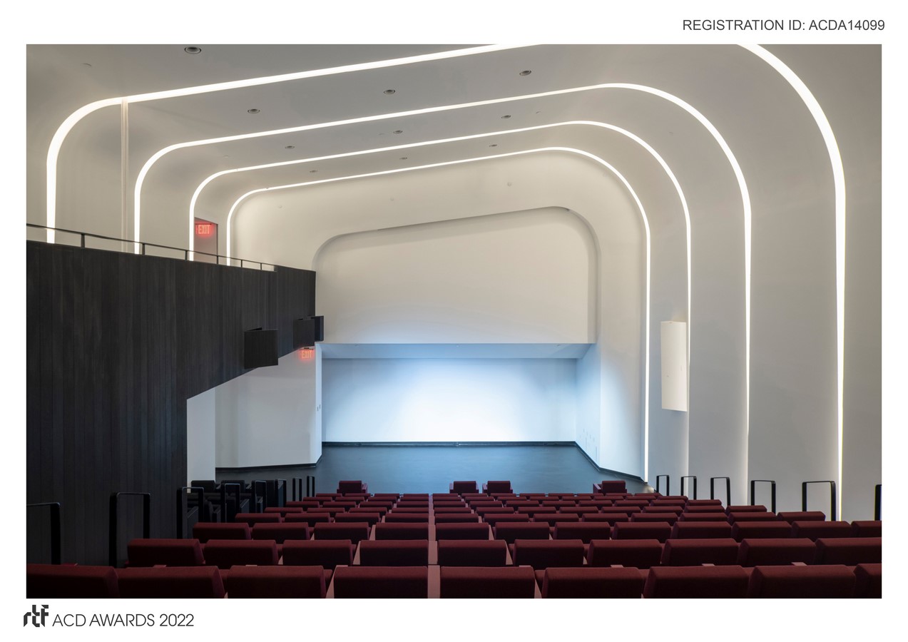 The Brooklyn Children’s Museum Auditorium is an architecturally dynamic insertion into a pre-existing shell that is aesthetically surprising and technically clever. The space features illuminated, warping, white panels that shingle along the walls and sloping ceiling, creating ribs of light and seamlessly integrating mechanical systems, fire safety, theatrical spots, and acoustic treatment.