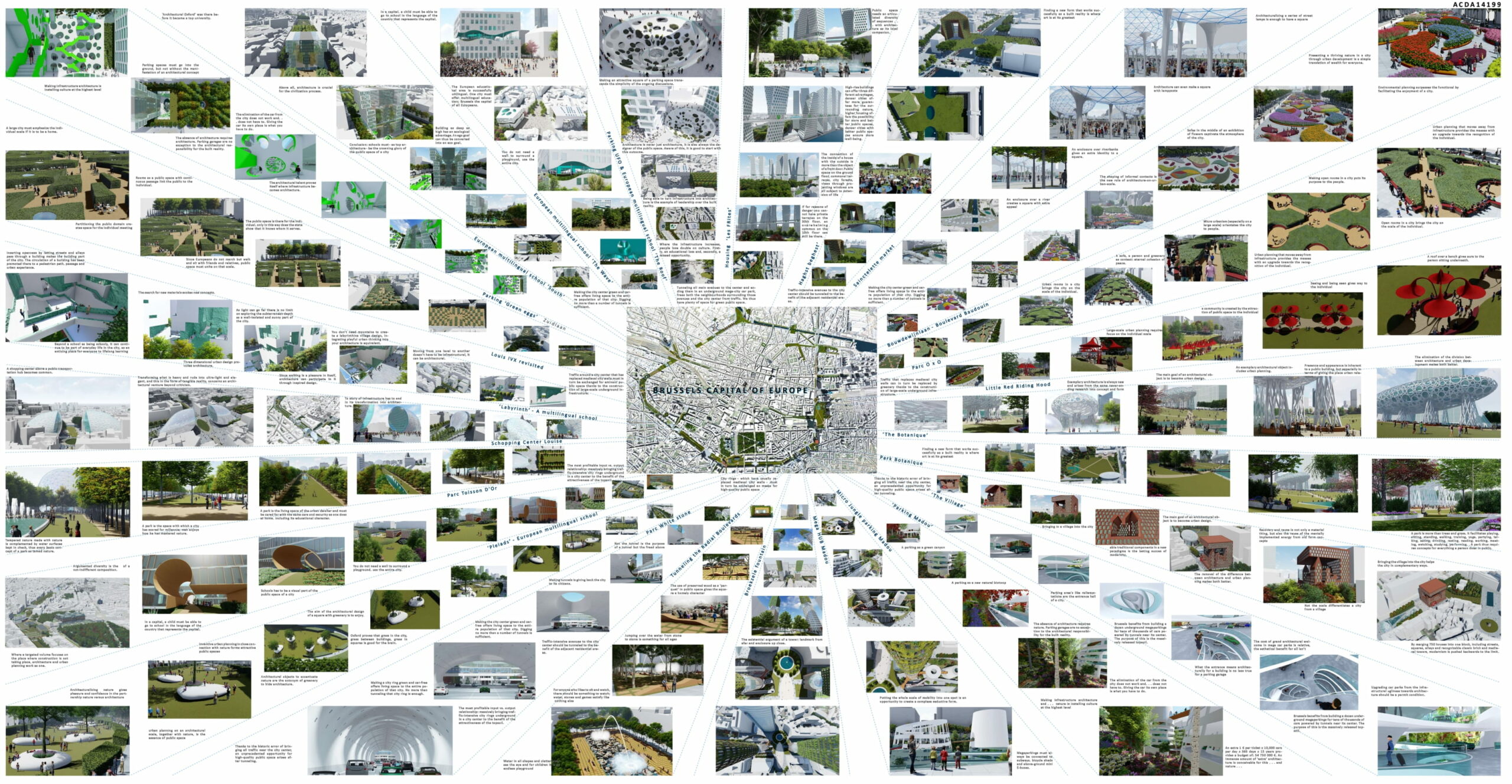 We use the newly obtained topsoil to optimize the public domain and to realize Brussels as the capital of Europe. A green ring with many attractive public spaces aims to provide European urban exemplary design *(10, 11, 12, 13). At the same time, some fifty public buildings are completing these new public spaces. Each of these buildings supports a distinctly European non-administrative function *( 14, 15, 16). Just under half of the buildings are school buildings *( 17, 18) where young people can go to school in their own national language and other European languages. The other buildings are cultural institutions that support the European identity and thus shape Brussels as the capital of all Europeans.