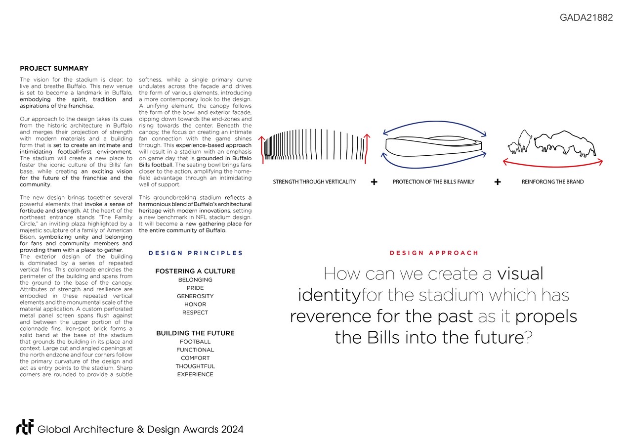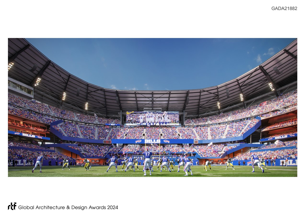 Our approach to the design takes its cues from the historic architecture in Buffalo and merges their projection of strength with modern materials and a building form that is set to create an intimate and intimidating football-first environment. The stadium will create a new place to foster the iconic culture of the Bills’ fan base, while creating an exciting vision for the future of the franchise and the community.