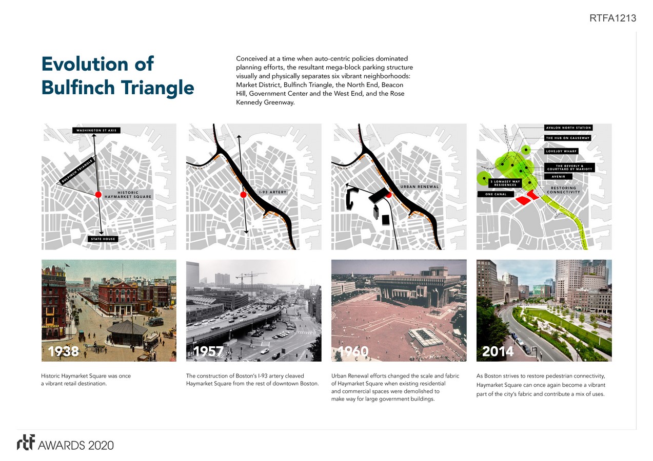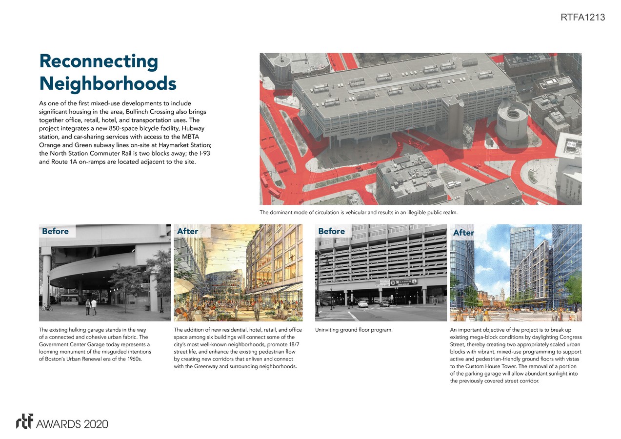 The Government Center Garage stands as a looming monument to the misguided intentions of Boston’s Urban Renewal era of the 1960s. Conceived at a time when auto-centric policies dominated planning efforts, the resultant mega-block parking structure visually and physically separates six vibrant neighborhoods – Market District, Bulfinch Triangle, the North End, Beacon Hill, Government Center, and the West End. Bulfinch Crossing will unlock the vast walkability and economic potential of the area by surgically removing portions of the garage, reknitting the surrounding context, and transforming the area into a dynamic mixed-use development.