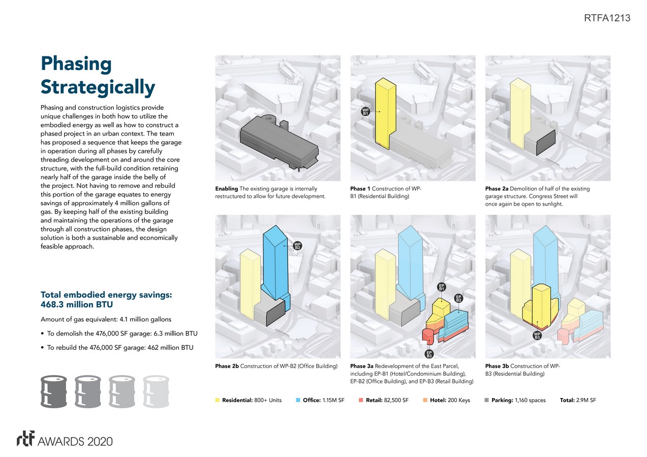 Phasing and construction logistics provided a twin set of unique challenges both in how to utilize the embodied energy of the garage as well as to construct a phased project in a busy urban context. Recognizing the opportunity for innovative phasing, the proposal threads development on and around the existing structure, with the full-build condition retaining nearly half of the garage. Not having to remove and rebuild the western half of the garage equates to energy savings of approximately four million gallons of gas, a solution that is both environmentally sustainable and economically feasible.