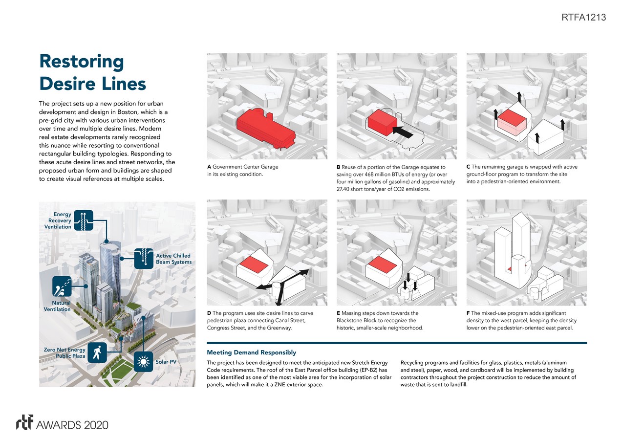 The project sets up a new position for urban development and design in Boston, which is a pre-grid city with multiple urban interventions over time and various desire lines. Modern real estate developments rarely recognized this nuance while resorting to conventional rectangular building typologies. Responding to these acute desire lines and street networks, the proposed urban form and buildings are shaped to create visual references at multiple scales. The proposal addresses these scales while demonstrating good density in Boston through rethinking typologies by creating slender towers with a smaller footprint. Further, the project site mediates numerous surrounding sites and historical palimpsests, while creating an urban gateway that sculpts to the natural street lines and reflects the organic geometry of the area’s urban grid.