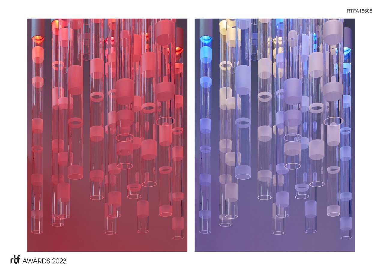 Each cylinder cap has a LED ring that sends light through the transparent areas, creating a colored glow only at the translucent bands and the bottom rings. The random patterns of bands create a ‘flicker” effect. The bespoke programming holds six different “scenes” that are either stagnant or changing (a 10-minute loop); however, the program can change quickly and easily. The scenes range from groupings of different tones of white lights (warm, cool) to a collage of numerous variations of color to a single color.