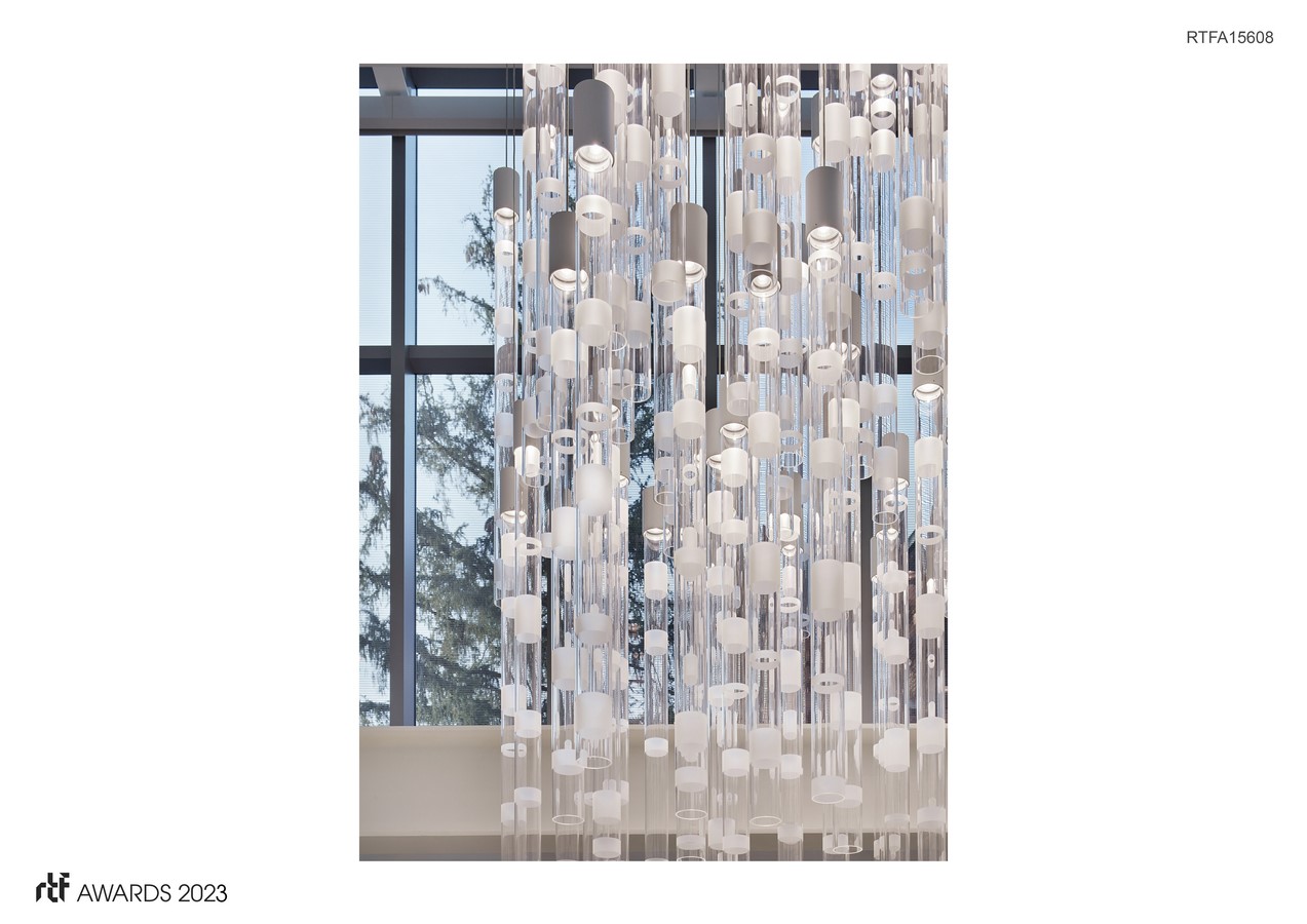 A new interior atrium between two science buildings provides a multi-level connection between classrooms, offices, and social spaces. As this major hub of activity overlooks the central green, the Dean wanted to create a light installation that would become a beacon from inside and out, bringing forward ideas about art and science. Her goal was to have a dynamic light installation with an eye toward active engagement.