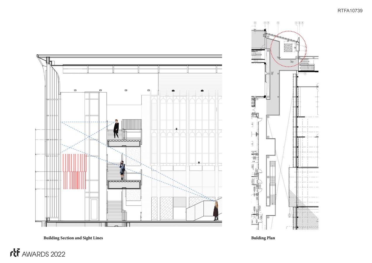 Campfire is a metaphor for the wonderful traditional gathering that brings people together around its glow. It is both the hearth and soul of the building, appearing very differently from ground-level, 2nd, or 3rd floor views. Depending on the furnishings below (which change depending on use), it can define a place for academic meetings, friends to gather, or just a quiet place to read under its glow.
