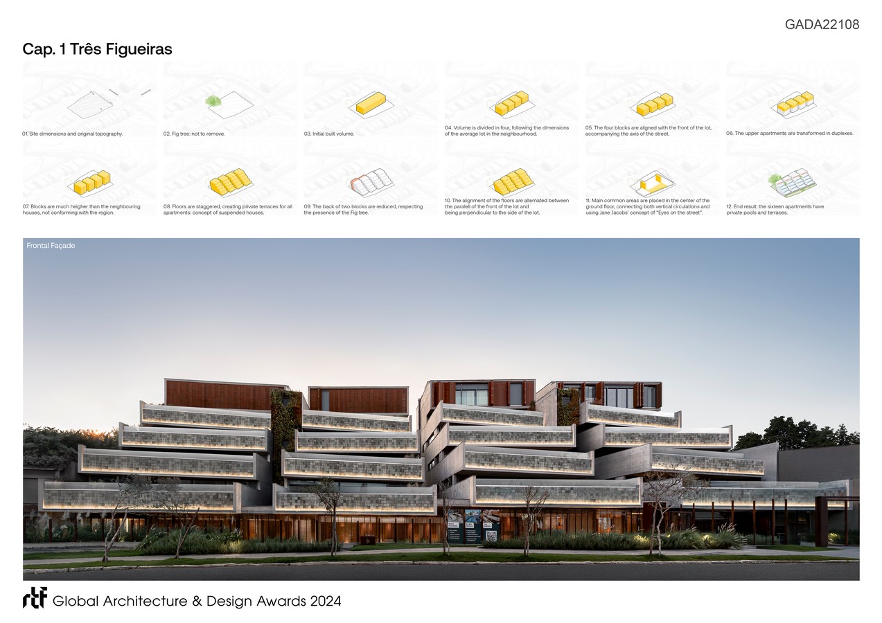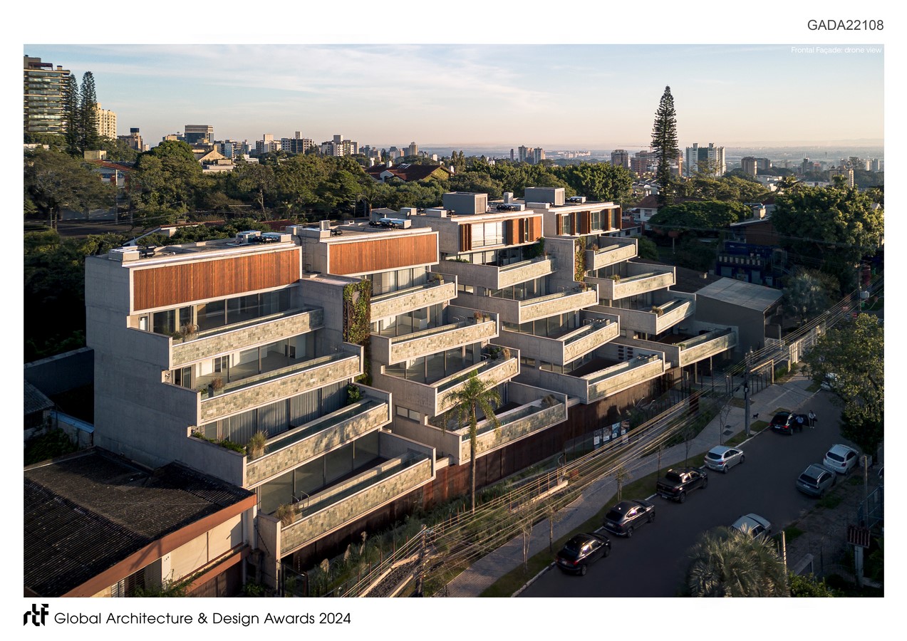 The terrain in question, on a slope, features one of the fig trees that gives the Três Figueiras neighborhood its name. As a premise of the project, all units are oriented towards the front, ensuring east and west orientations, as well as views of the remarkable tree.