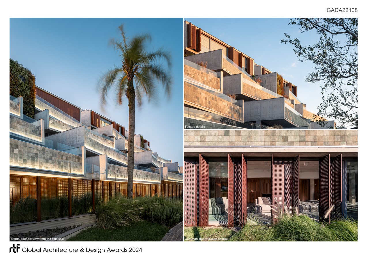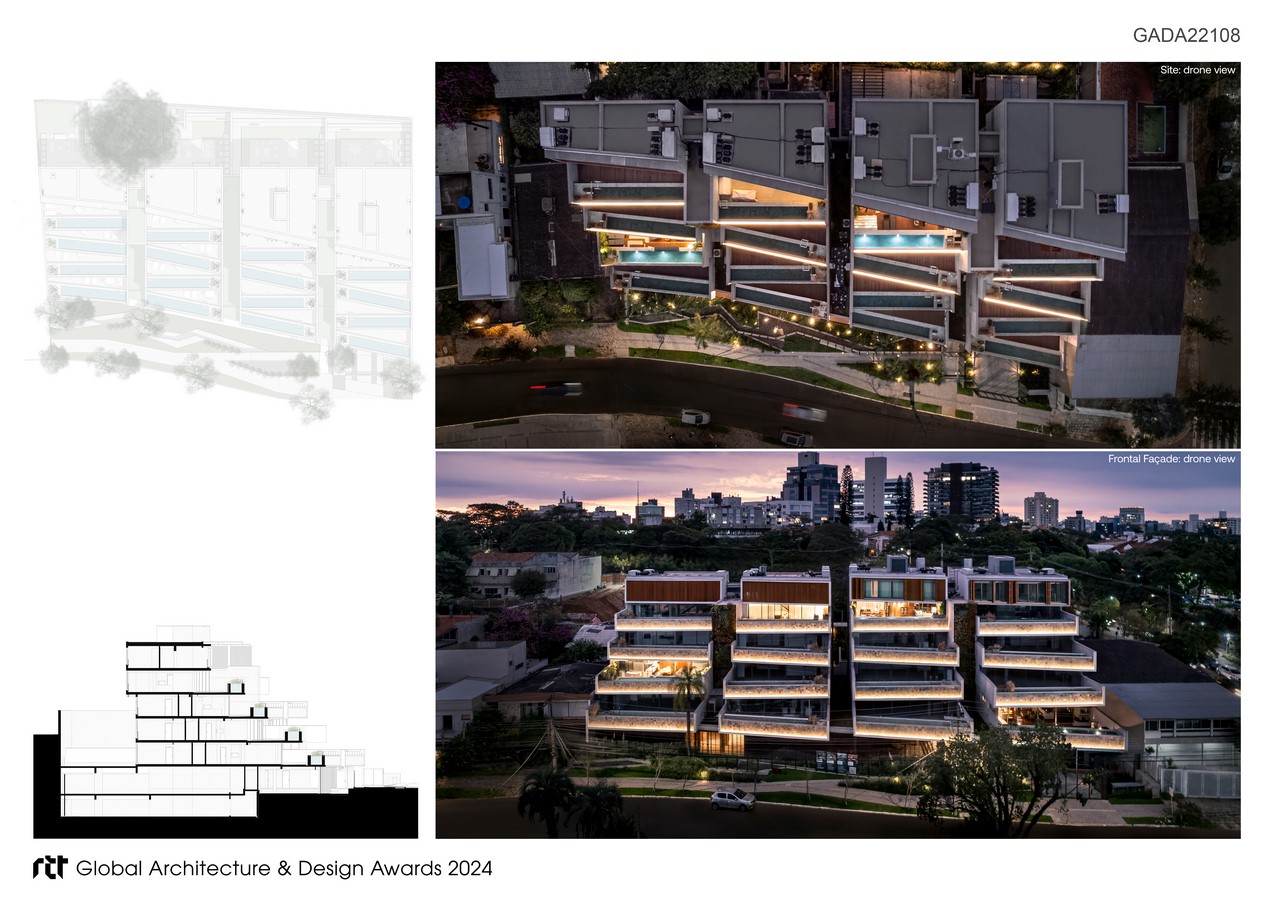 The project’s volumetrics stem from the idea of following the geometric pattern of the surroundings: the four existing lots serve as the foundation for four blocks, each containing four staggered apartments. This staggered arrangement is not merely formalistic: the modification of the original prism reduces the impact of the building on the region, distancing it from the public road on each floor. Additionally, it follows the original topography of the land and creates private terraces with linear pools. Between the floors, the apartment’s front is either parallel to the street in front or perpendicular to the side boundary, creating dynamism for the volumes.