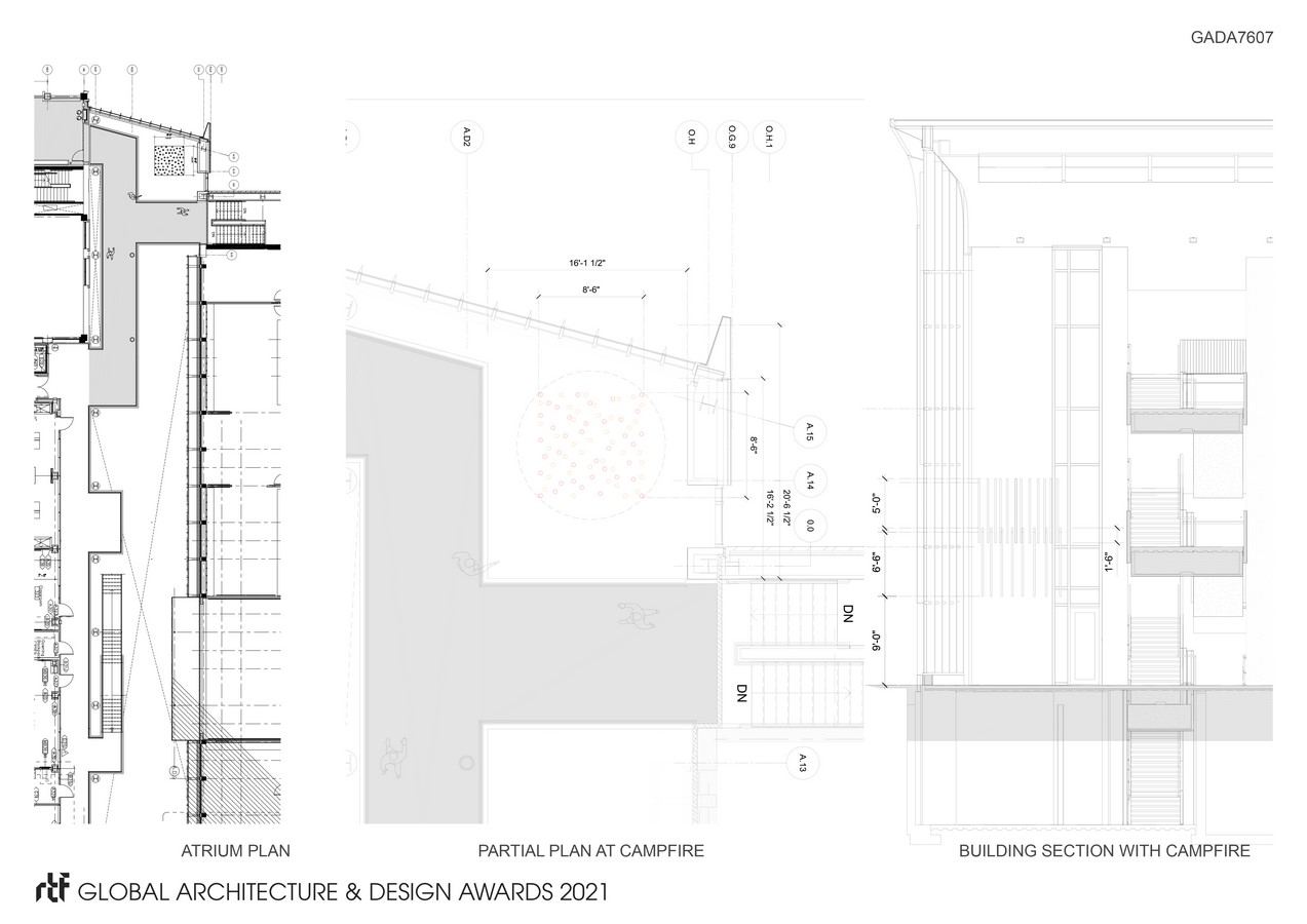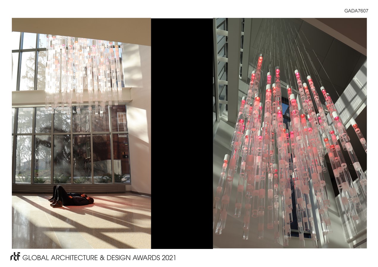 Carleton College is a collaborative community that encourages curiosity and intellectual adventure of the highest quality. With a student body of 2000, it is a place where everyone knows each other, and intimate meetups are central to the academic and social experience. The enclosure of a courtyard between two science buildings created an opportunity for a light installation. Campfire is located at the west entry to the atrium, therefore it can be experienced from inside on all three levels of the space and serves as a beacon, seen from the campus’ central lawn. Campfire is the soul of the building with its ability to inspire discourse and open conversation.