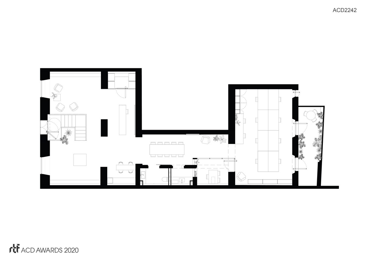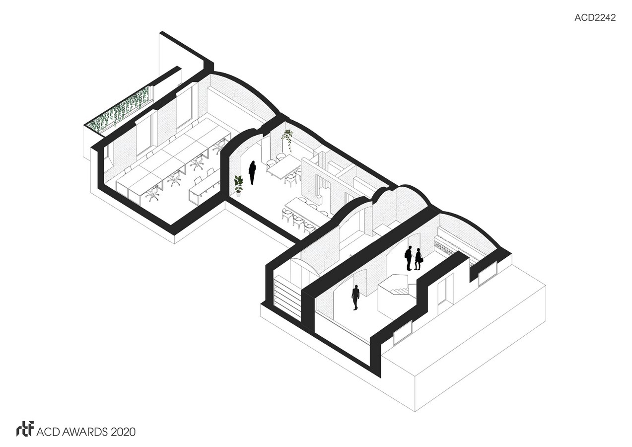 All the factory walls and solid brick roof vaults are whitewashed, stripping off any previous cladding. They remain visible, with their patinas, marks and wounds that allow a historical reading. A unique finishing material in the enclosure is combined with flooring, doors and furniture made of pine wood and white steel for carpentry.
