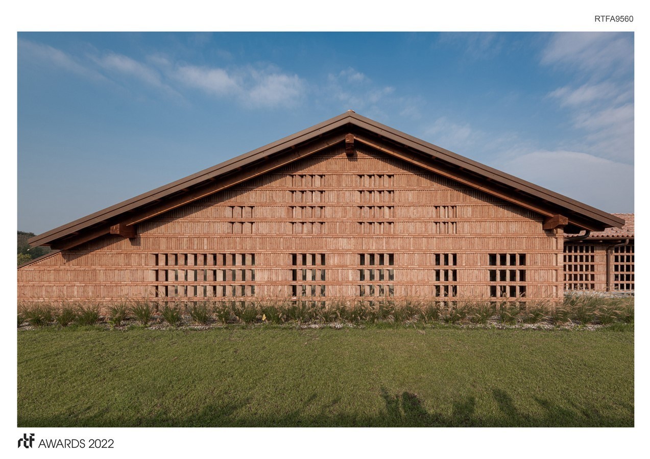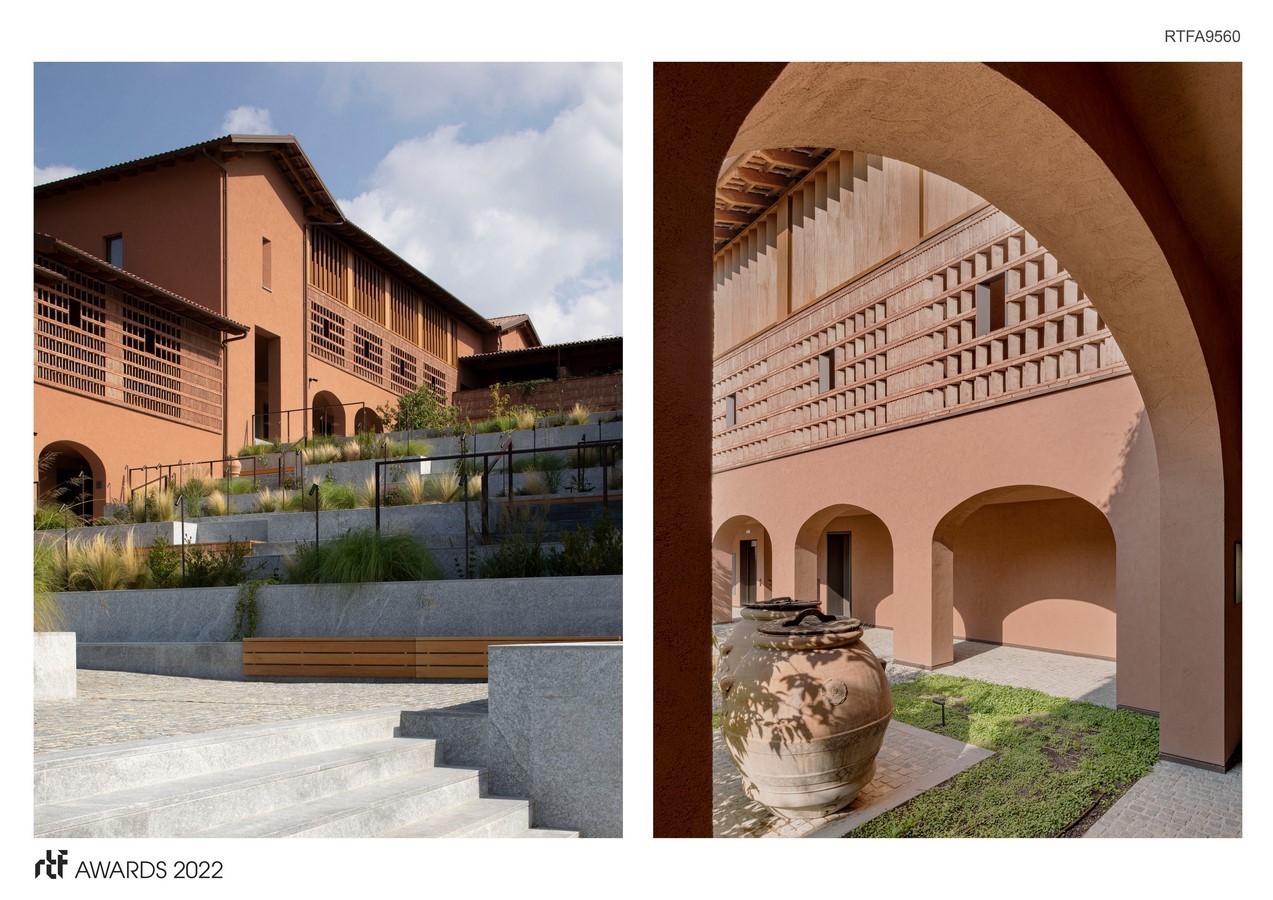 The building develops in a C-shaped plan around an open piazza that cascades down the hillside in a progression of terraces towards the valley. The three wings of the building frame the breathtaking view that can reach as far as the Monviso peak.