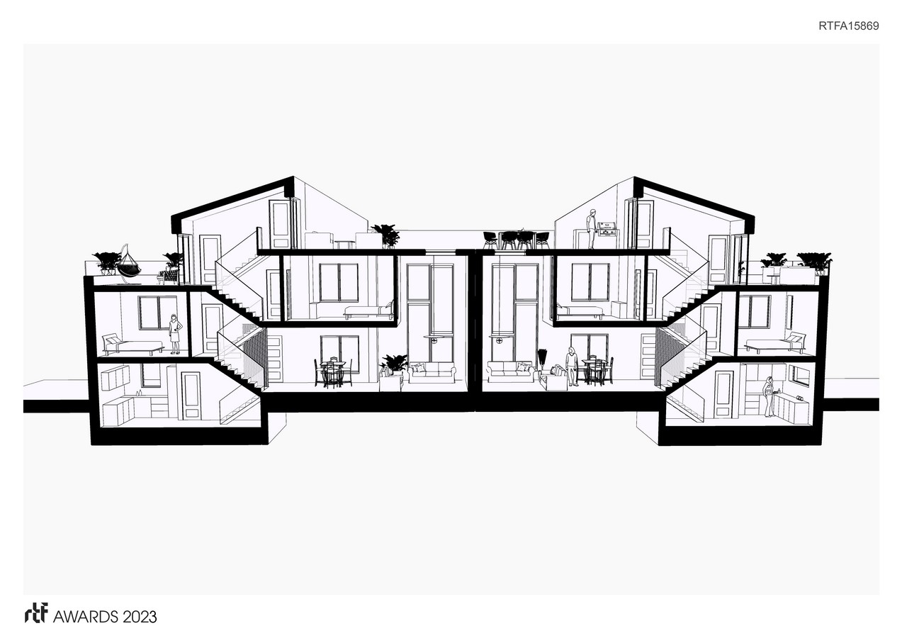 Two connected houses were obtained, each gravitating around its own staircase, having the living area developed on the first two levels (kitchen in the basement, living room on the ground floor), the night area on the next two levels (two bedrooms) and three areas of terraces, one common, central, intended for the common activities of the two families, as well as two individual, separate areas.