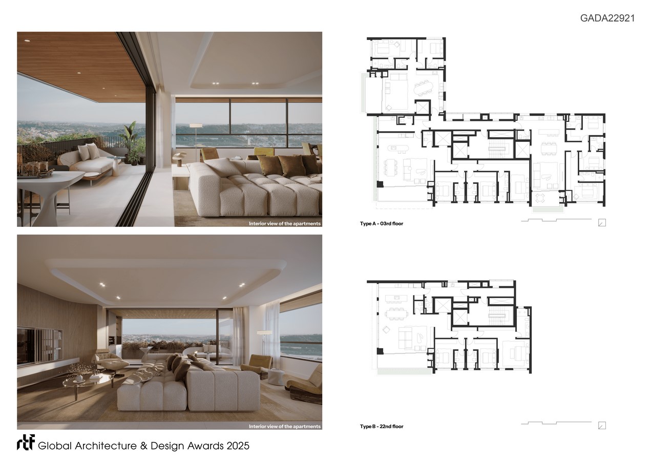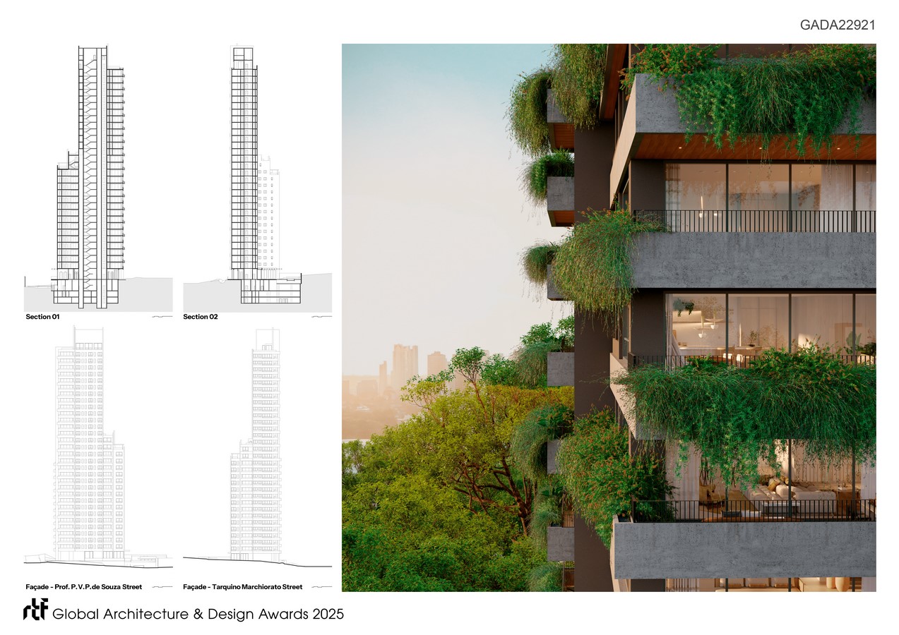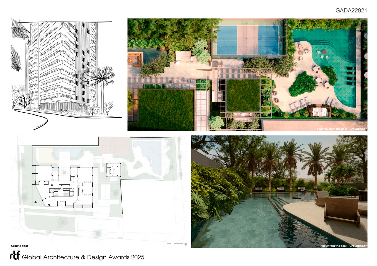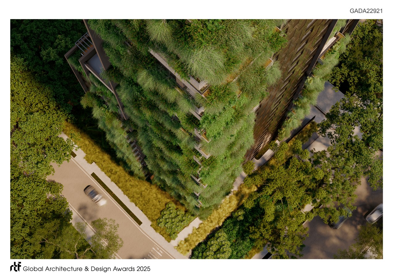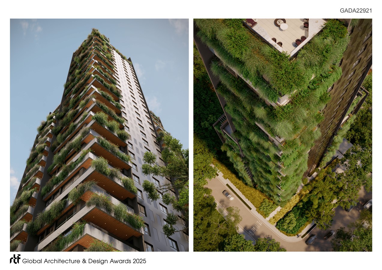 The building includes 61 units over 32 floors, offering a wide variety of apartment layouts designed for contemporary, diverse ways of living. The rooftop was envisioned as a suspended garden, a landscaped terrace with organic topography and panoramic views of the city, offering residents a place for reflection, rest, and connection with the sky. The project is an architectural proposition: a space where the natural and the urban merge. Every design decision was informed by a desire to offer not only spatial quality but also a sensory and poetic experience of dwelling. The project proposes a lifestyle that is grounded, elegant, and deeply attuned to the environment.