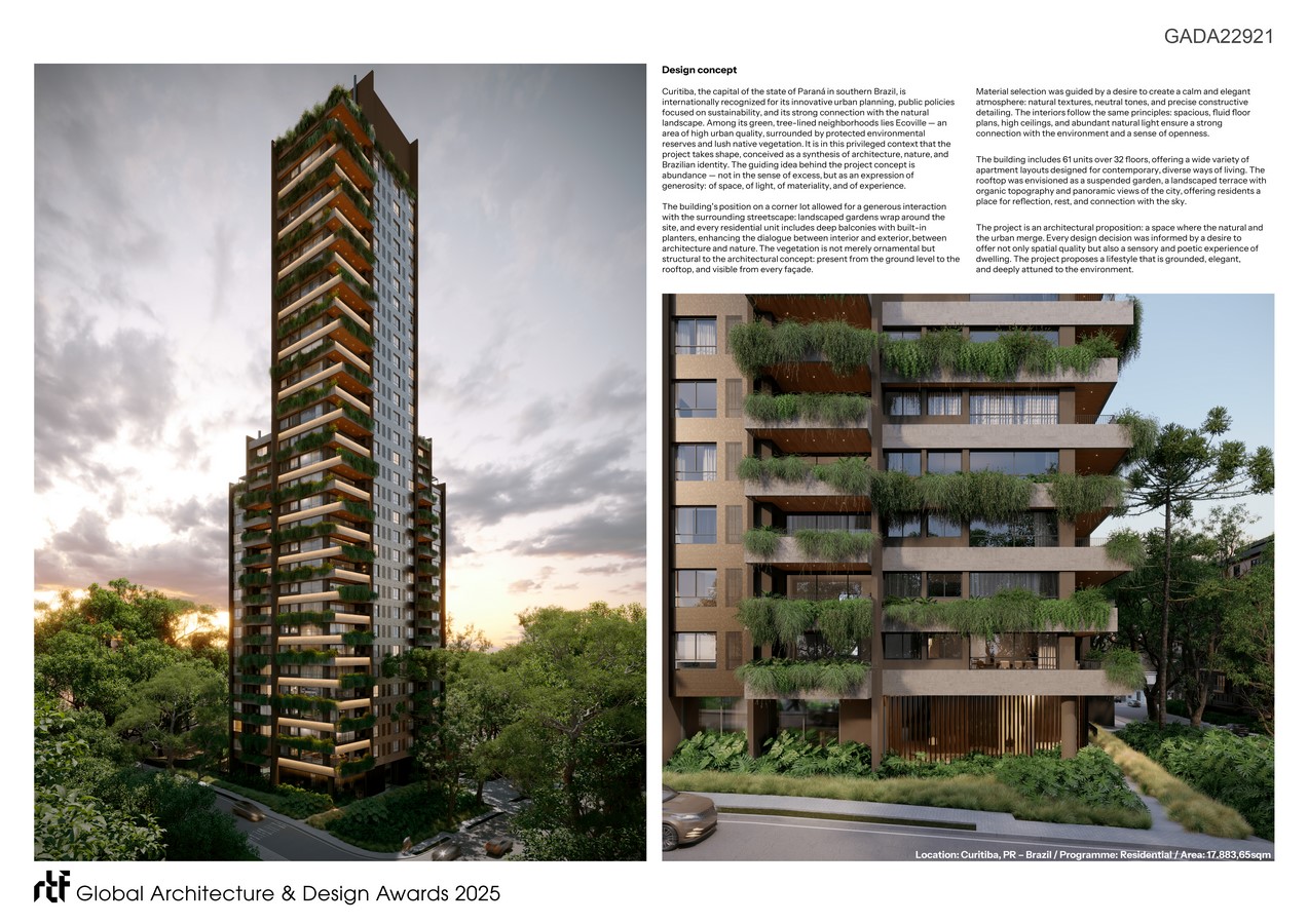 Curitiba, the capital of the state of Paraná in southern Brazil, is internationally recognized for its innovative urban planning, public policies focused on sustainability, and its strong connection with the natural landscape. Among its green, tree-lined neighborhoods lies Ecoville — an area of high urban quality, surrounded by protected environmental reserves and lush native vegetation. It is in this privileged context that the project takes shape, conceived as a synthesis of architecture, nature, and Brazilian identity.The guiding idea behind the project concept is abundance — not in the sense of excess, but as an expression of generosity: of space, of light, of materiality, and of experience.