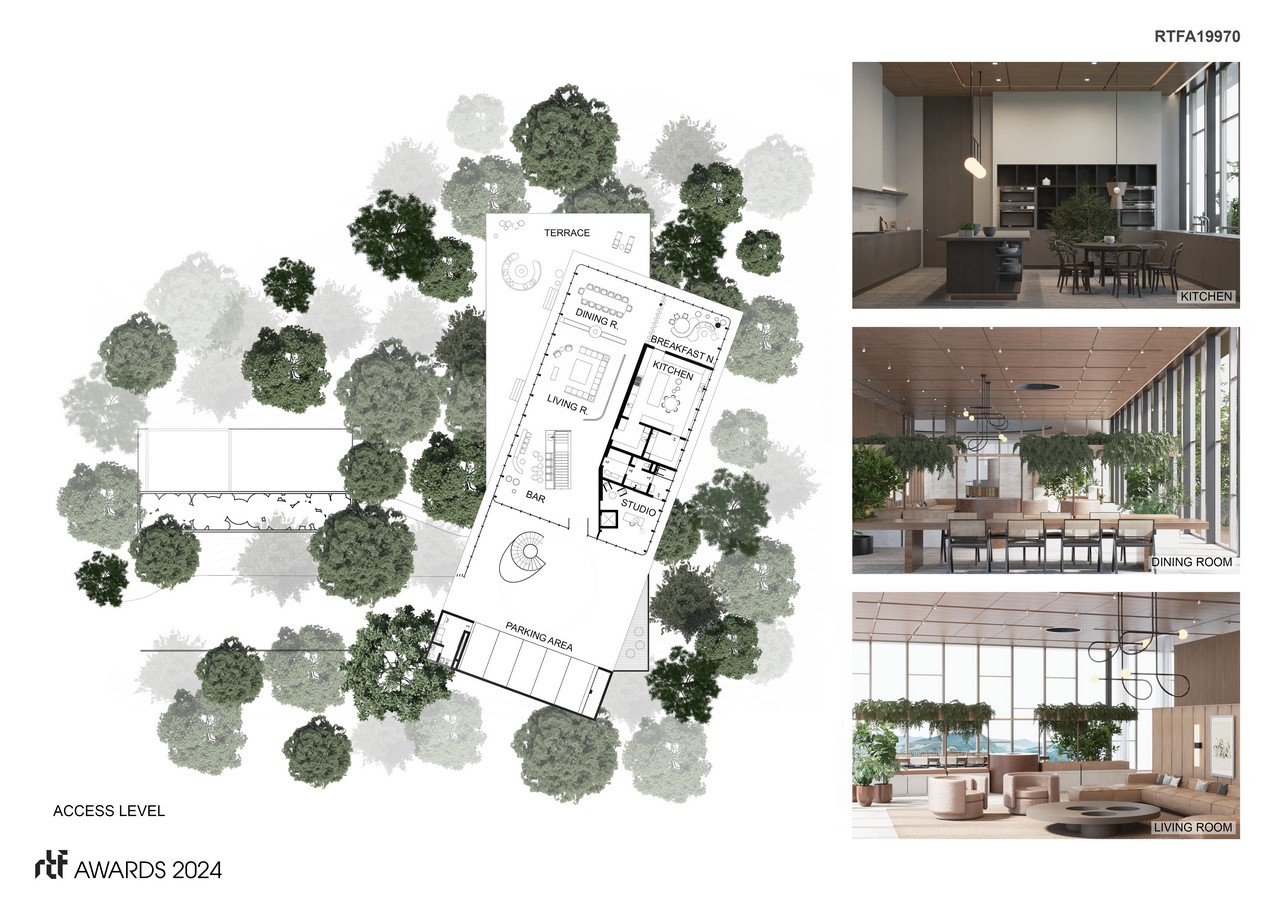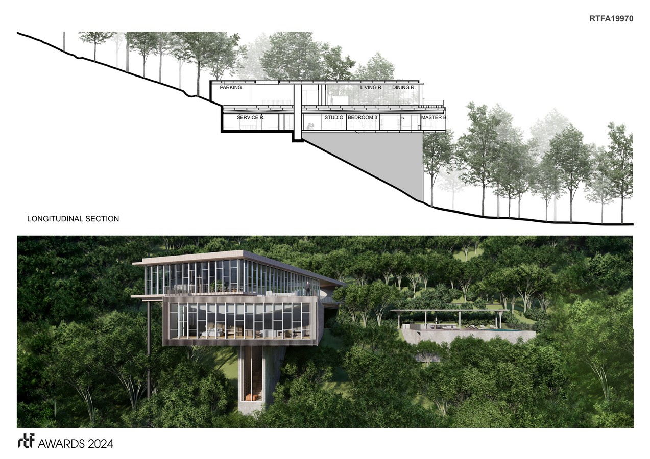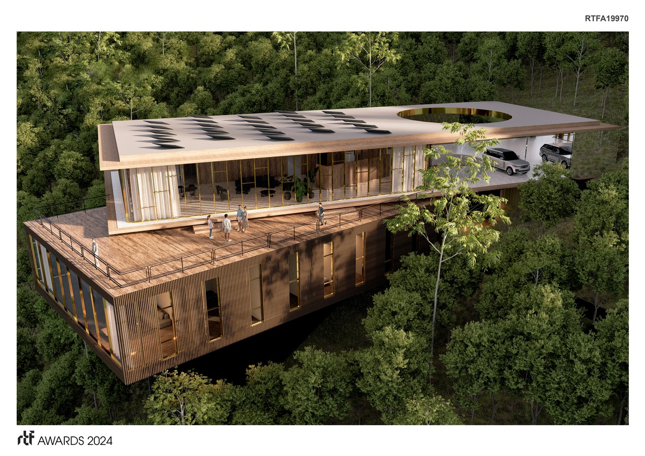 At the heart of Casa Santuario lies its profound connection with nature, a testament to its unwavering commitment to environmental preservation. Resting delicately upon a sturdy concrete column, the house gracefully floats above the verdant tree canopy, offering panoramic views of the surrounding forest and cityscape. This innovative design minimizes its ecological impact and fosters an intimate relationship between inhabitants and their natural surroundings.