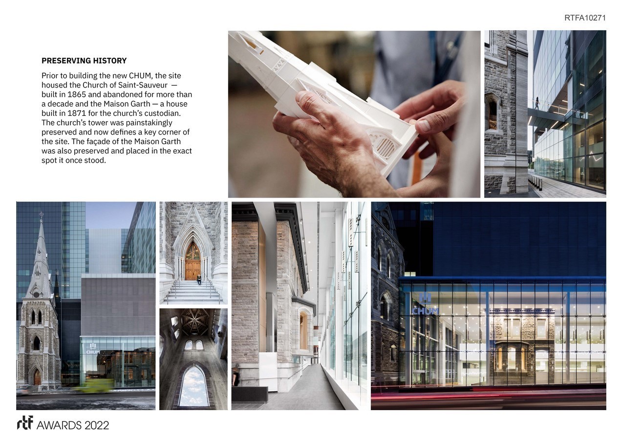 Although many hospitals integrate art, the CHUM houses the largest collection of public art in the history of Quebec’s public art program. Works range from mountain peaks spanning eight stories on the façade of the ambulatory care center to a first-of-its-kind sound installation. History also becomes art with the thoughtful integration of architectural artifacts. Prior to the new complex, the site housed an abandoned church and the Garth House — a building that once housed the church custodian. To preserve the legacy of these structures, the steeple from the church was preserved and defines a key corner of the site, and two of the Garth House facades are integrated into the main interior hall — visible through the CHUM’s transparent walls.
