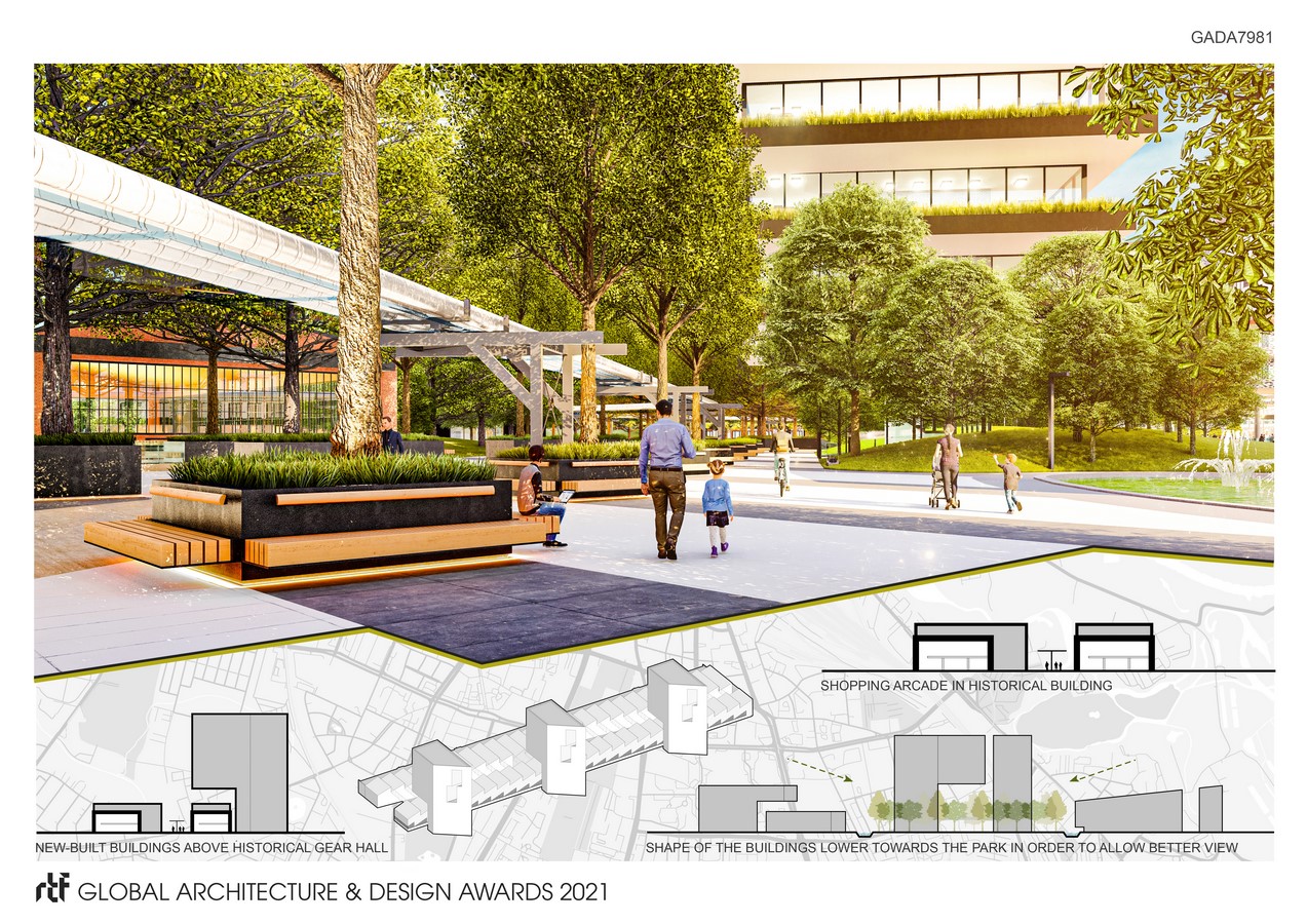 The planned area is limited by two main streets from the south and west respectively, and by a railway line from the north and east. This location provides excellent access to the city centre and other parts of Wroclaw. The Hutmen site, situated in the eastern part of the investment, may become the last point of the Rychter Promenade. This iconic walking route along the railway embankment would finally have a clear finish line. The history of the area was of key importance in the design of Central Park Wroclaw. In the area of the investment, there are objects included in the conservation register, which will be preserved just like other historic buildings and city sculptures, and will be additionally displayed in the new space. The heart of the estate will be the central park, which will be accessed by a square along the modernised Gear Hall.