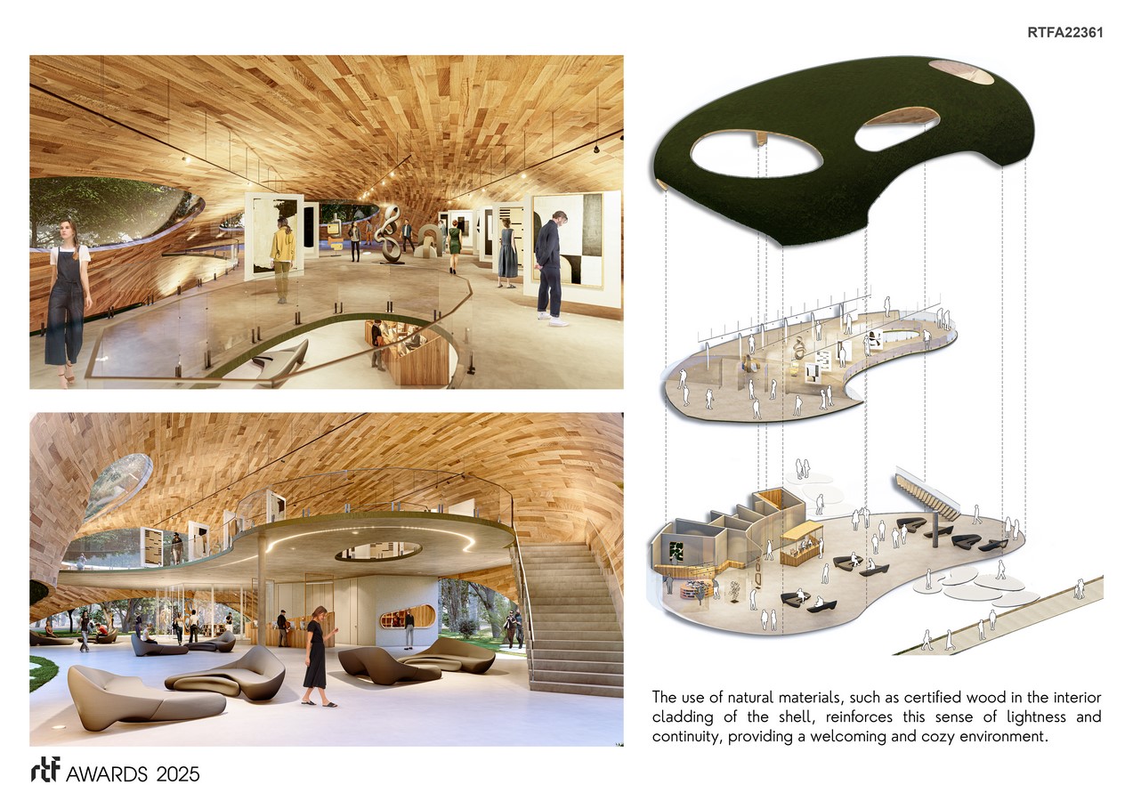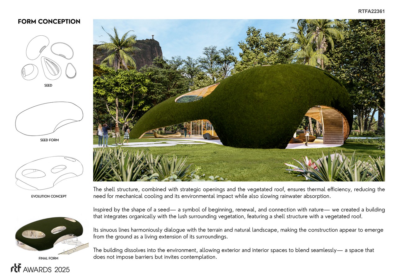 The shell structure, combined with strategic openings and the vegetated roof, ensures thermal efficiency, reducing the need for mechanical cooling and its environmental impact while also slowing rainwater absorption. Inspired by the shape of a seed— a symbol of beginning, renewal, and connection with nature— we created a building that integrates organically with the lush surrounding vegetation, featuring a shell structure with a vegetated roof.