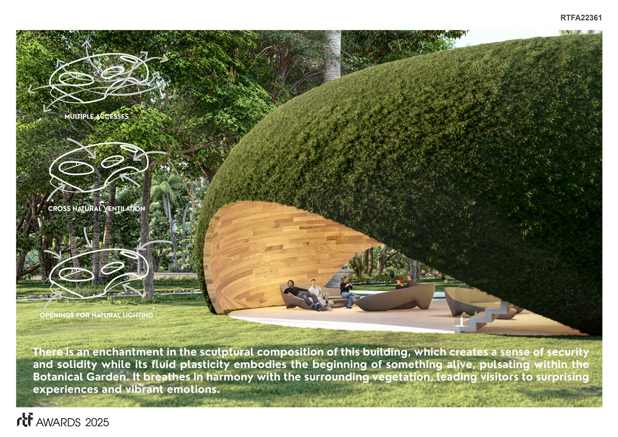 There is an enchantment in the sculptural composition of this building, which creates a sense of security and solidity while its fluid plasticity embodies the beginning of something alive, pulsating within the Botanical Garden. It breathes in harmony with the surrounding vegetation, leading visitors to surprising experiences and vibrant emotions.