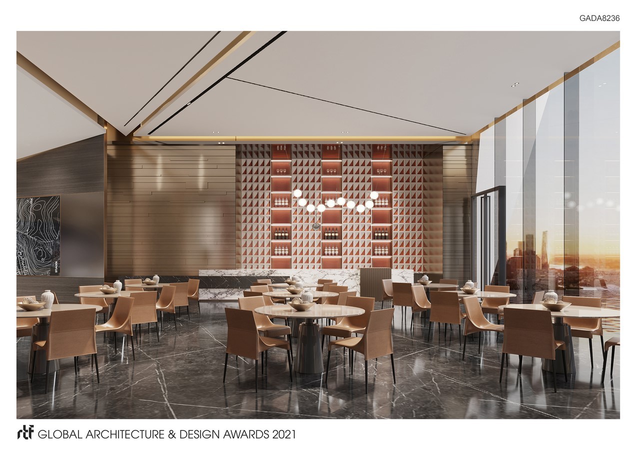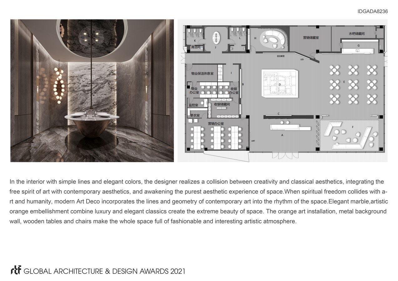 Elegant marble,artistic orange embellishment combine luxury and elegant classics create the extreme beauty of space. The orange art installation, metal background wall, wooden tables and chairs make the whole space full of fashionable and interesting artistic atmosphere.