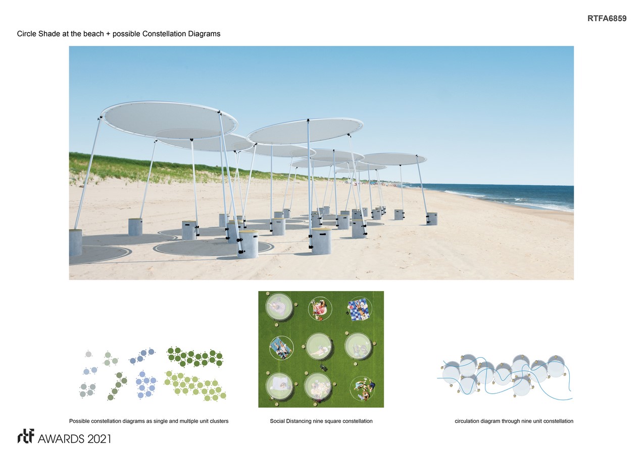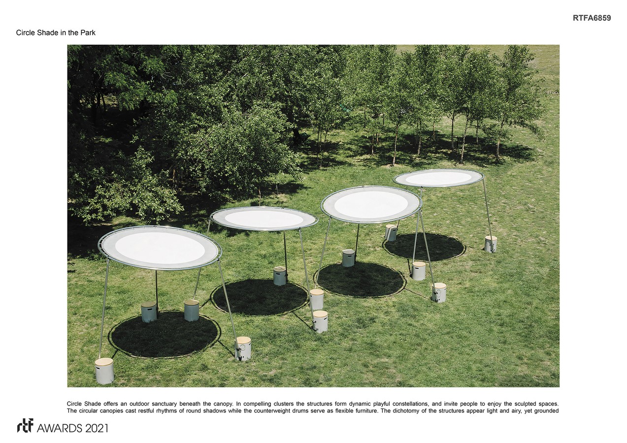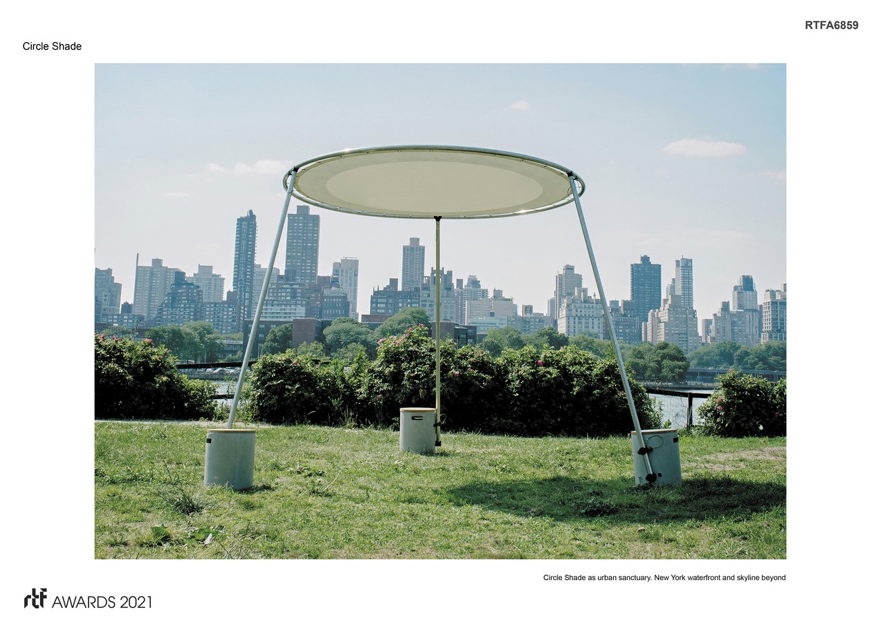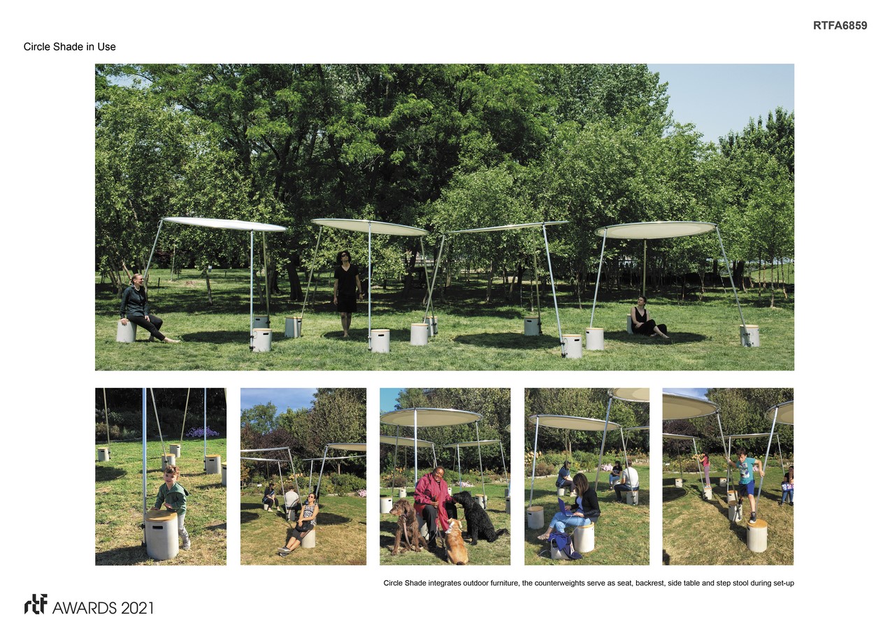 Circle Shade synthesizes renewal of the umbrella shade and mobile tent structures. It eliminates the center pole common for opening and closing parasols and offers a flexible layout and uncluttered alternative to square tents. With the challenges of climate change, and need for protection against the sun’s harmful rays, the canopy system proposes a new type of space for improved outdoor living quality. It’s flexible and integrates with ease offering an outdoor sanctuary with open space, and unobstructed views beneath the canopy.
