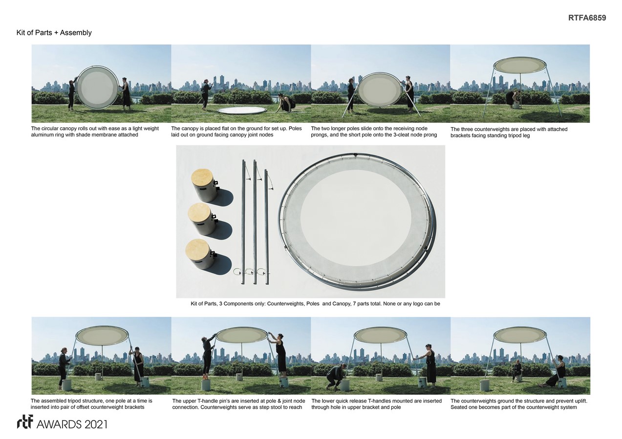 The design vocabulary is minimal and refined based on the structural tripod concept. Harmonizing system with detail, the distilled composition is formed by two fundamental geometries: circle and triangle. A single unit consists of 3 main components, and only 7 parts: 1 canopy, 3 poles and 3 cylindrical counterweights. The canopy provides for branding, and is circular, to roll for ease of mobility to set up.