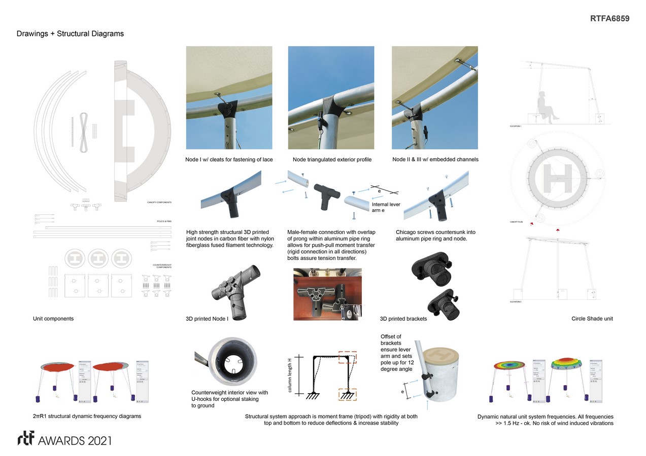 Circle Shade canopy system is the winning project of an annual design/build competition in New York. The brief called for four portable demountable structures to populate a highly active park environment, for adaptable use, and assembly in 10-15 minutes by one to two people. The size of a unit was defined for a maximum of 8 x 8 feet. Extensive staking to the ground was discourage, and the option for integrating branding was welcomed.