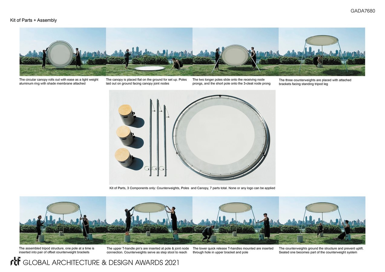Assembly of a unit can be done in less than 5 minutes by 1 to 2 people. The counterweights function as furniture: seat, back rest and tabletop, and serve as step stool during set up. Circle Shade offers space for both social interaction and distancing. It sets up as single unit or in compelling clusters, with option for a variation of arrangements in dynamic playful constellations