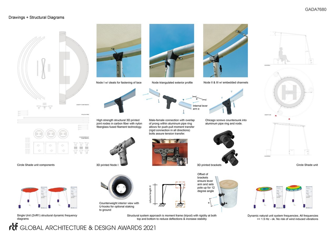 Circle Shade canopy system is the winning project of an annual design/build competition in New York. The brief called for four portable demountable structures to populate a highly active park environment, deployable for adaptable use, and assembly in 10-15 minutes by one to two people. The size of a unit was defined for a maximum of 8 x 8 feet. Extensive staking to the ground was discourage, and the option for integrating branding was welcomed.