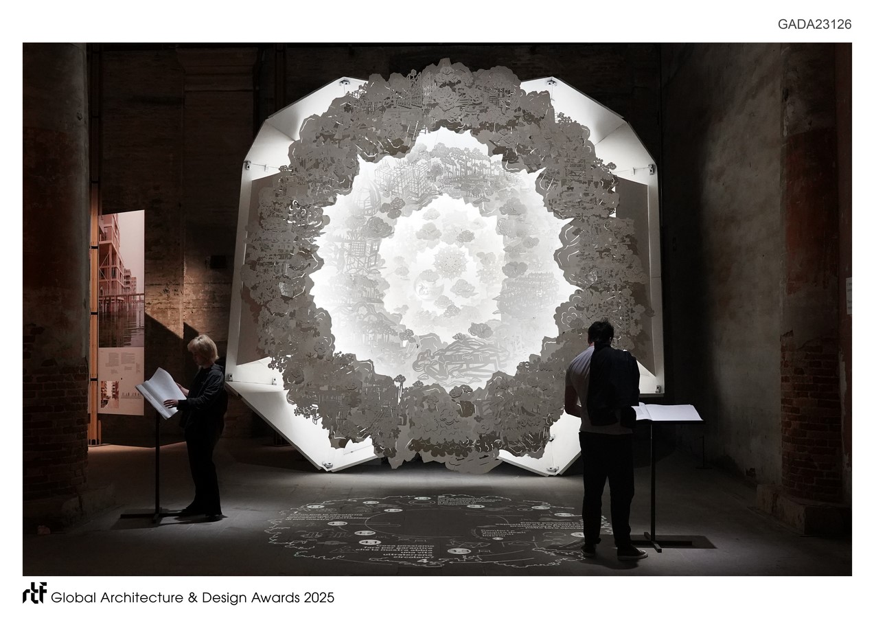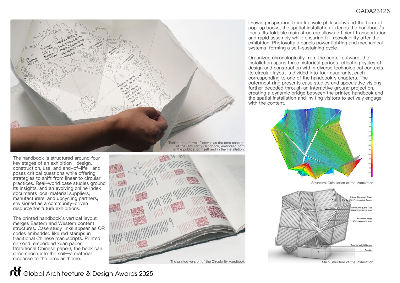 Drawing inspiration from lifecycle philosophy and the form of pop-up books, the spatial installation extends the handbook’s ideas. Its foldable main structure allows efficient transportation and rapid assembly while ensuring full recyclability after the exhibition. Photovoltaic panels power lighting and mechanical systems, forming a self-sustaining cycle. Organized chronologically from the center outward, the installation spans three historical periods reflecting cycles of design and construction within diverse technological contexts. Its circular layout is divided into four quadrants, each corresponding to one of the handbook’s chapters. The outermost ring presents case studies and speculative visions, further decoded through an interactive ground projection, creating a dynamic bridge between the printed handbook and the spatial installation and inviting visitors to actively engage with the content.