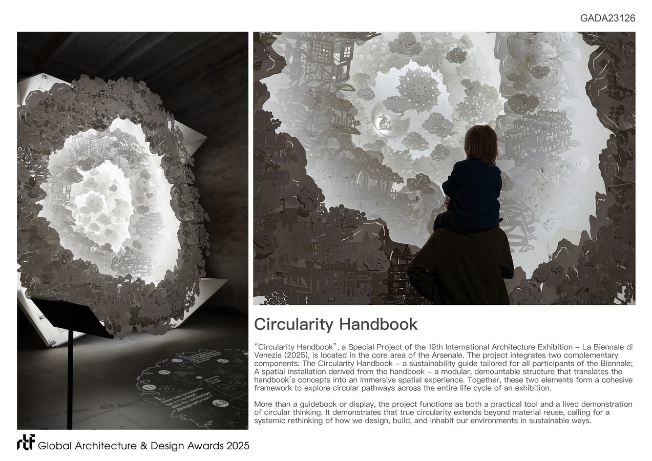 “Circularity Handbook”, a Special Project of the 19th International Architecture Exhibition – La Biennale di Venezia (2025), is located in the core area of the Arsenale. The project integrates two complementary components: The Circularity Handbook – a sustainability guide tailored for all participants of the Biennale; A spatial installation derived from the handbook – a modular, demountable structure that translates the handbook’s concepts into an immersive spatial experience. Together, these two elements form a cohesive framework to explore circular pathways across the entire life cycle of an exhibition.