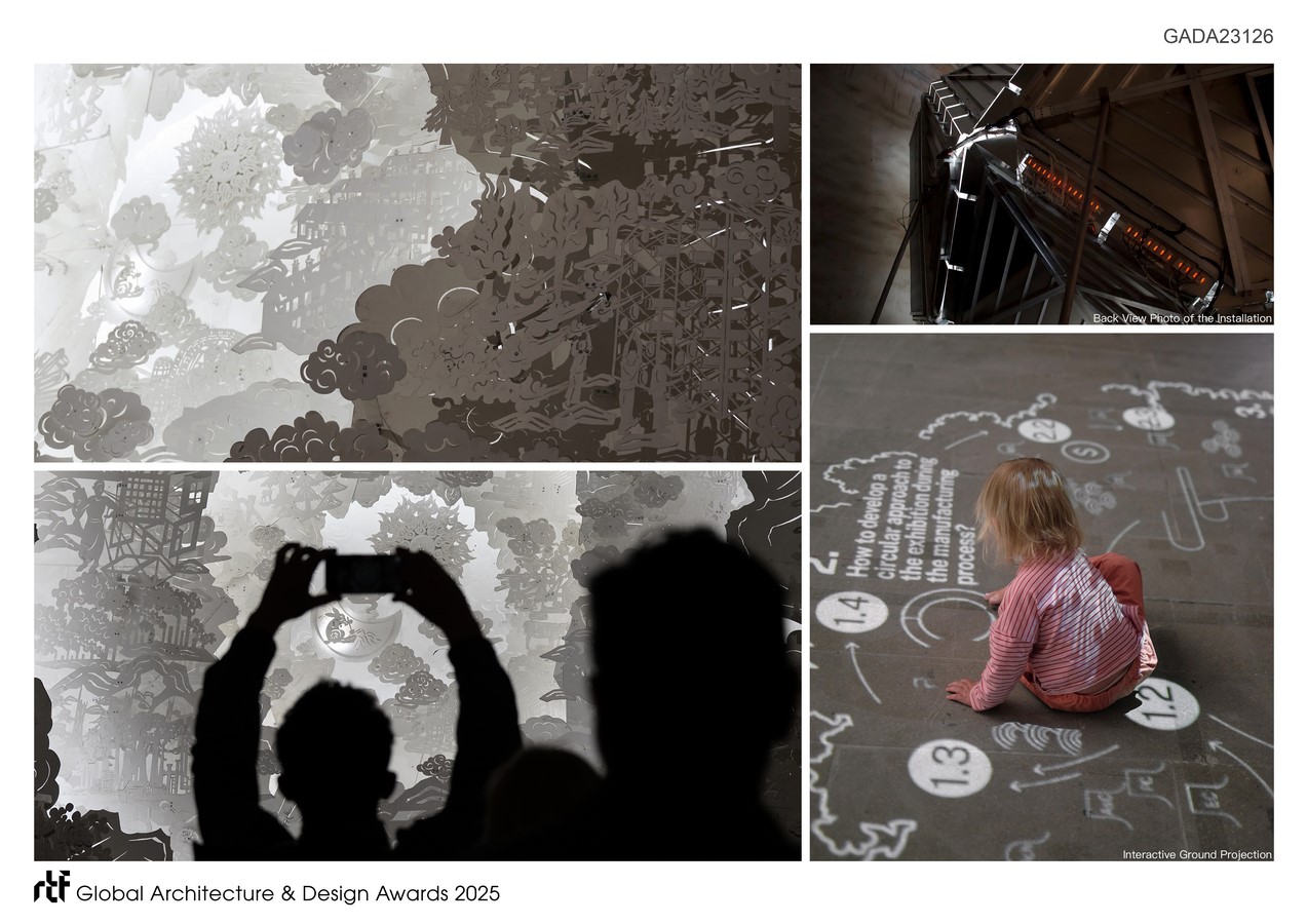 - Immersive and Interactive: Ground projections and spatial sequences translate abstract ideas into a participatory, experiential environment, with some patterns within the installation dynamically moving to enhance engagement.