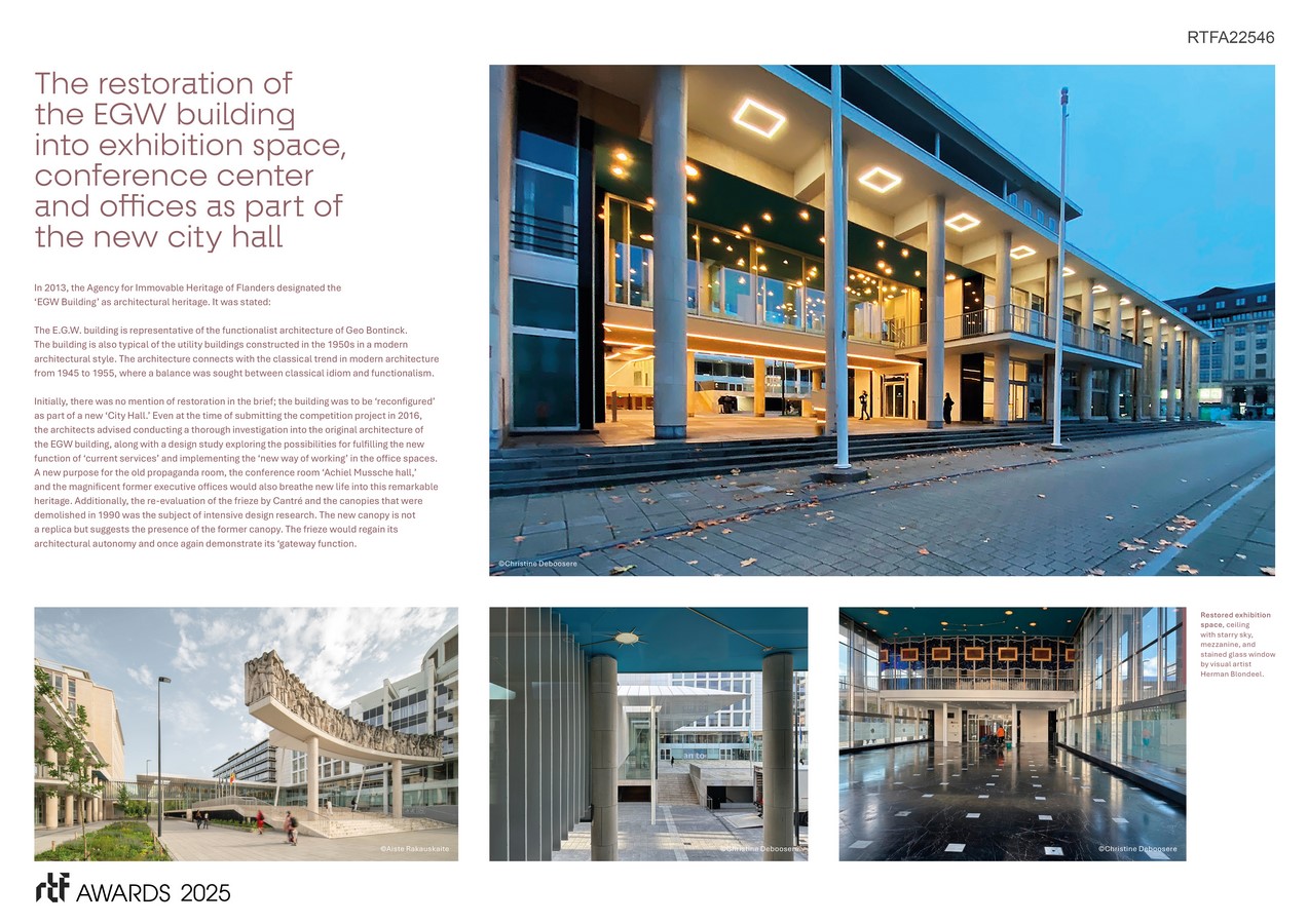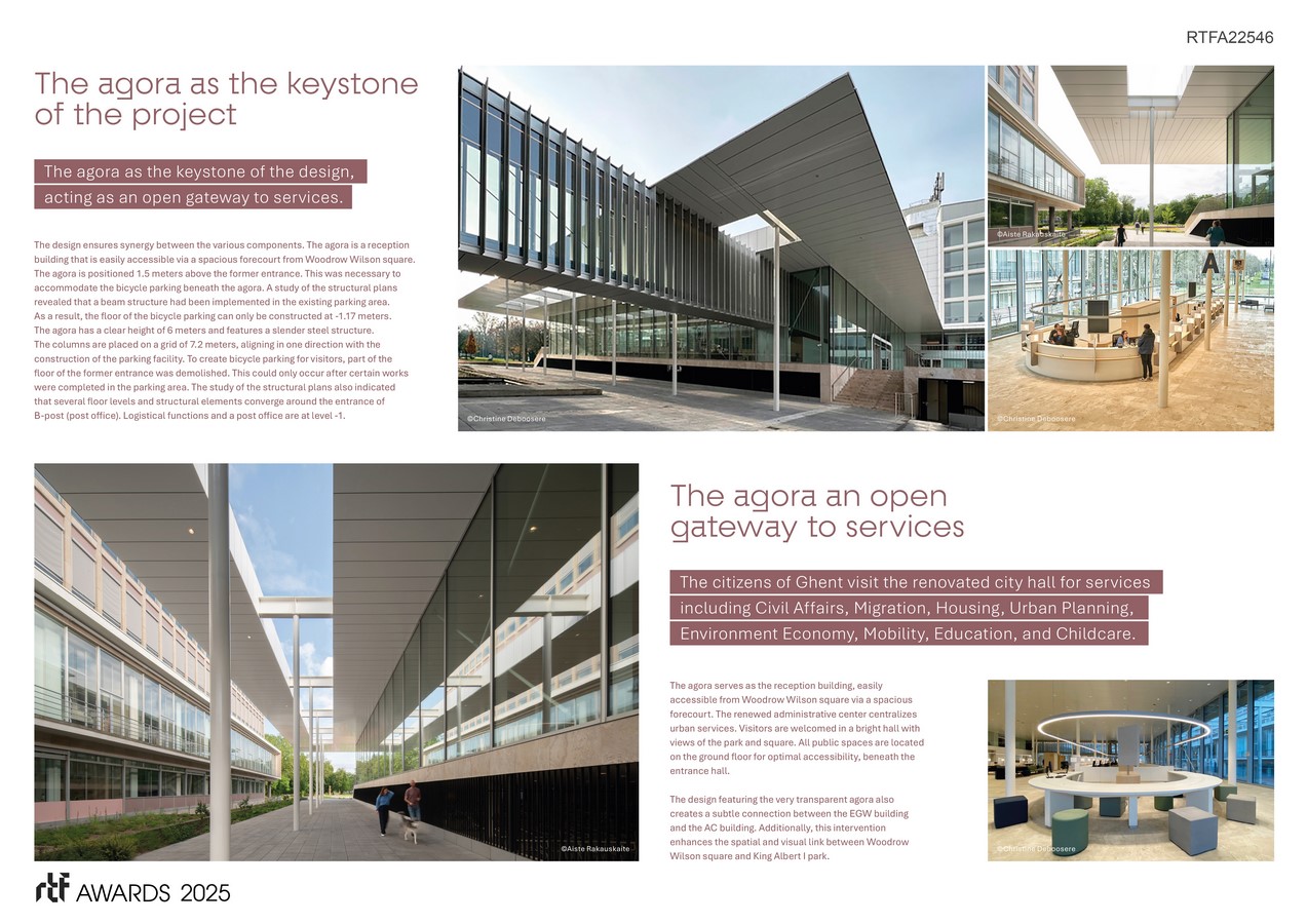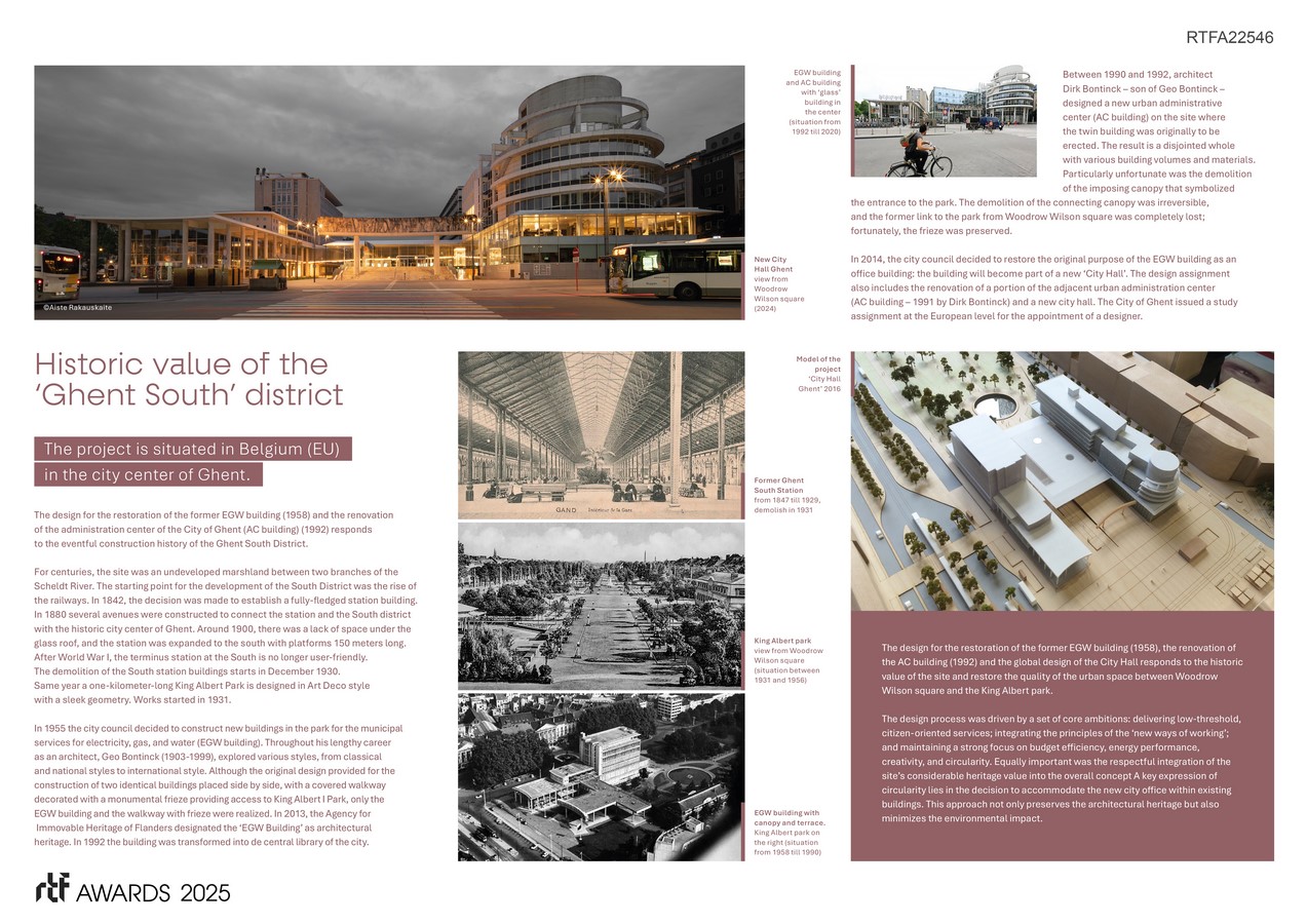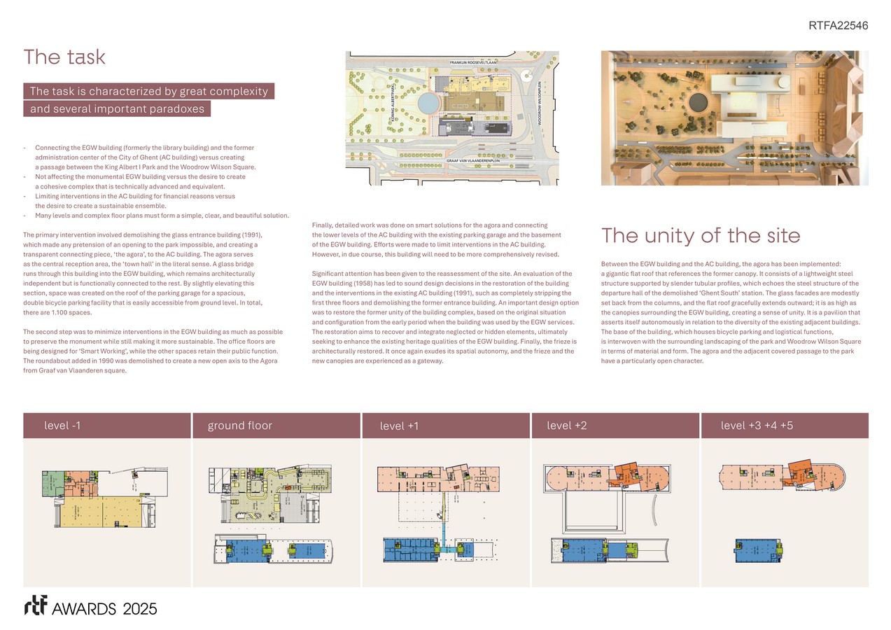The city counsel of the Belgian City of Ghent commissioned a study at the European level. The study included the development of a master plan for the accessibility of the city buildings at Woodrow Wilson Square, King Albert Park, the study of traffic flows, as well as the restoration of the classifide modernist ‘EGW building’ (former library building 1960) and the redesign of the publicly accessible parts of the city’s administrative center (AC building).