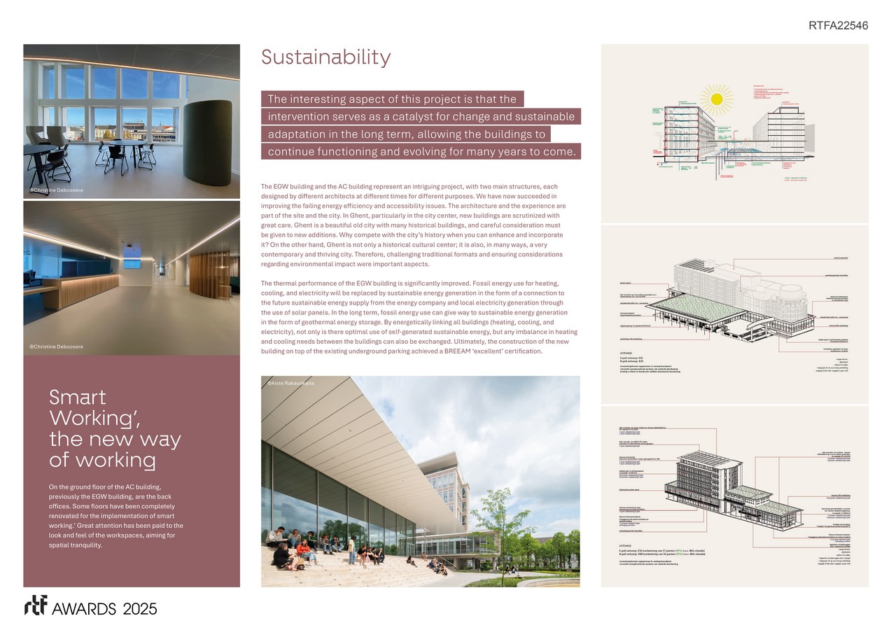 Significant attention has been given to the reassessment of the site. An evaluation of the classified modernist EGW building (Geo Bontinck 1958) has led to sound design decisions in the restoration of the building and the interventions in the existing administrative center (AC – buildibng 1991), such as completely stripping the first three floors and demolishing the former entrance building.