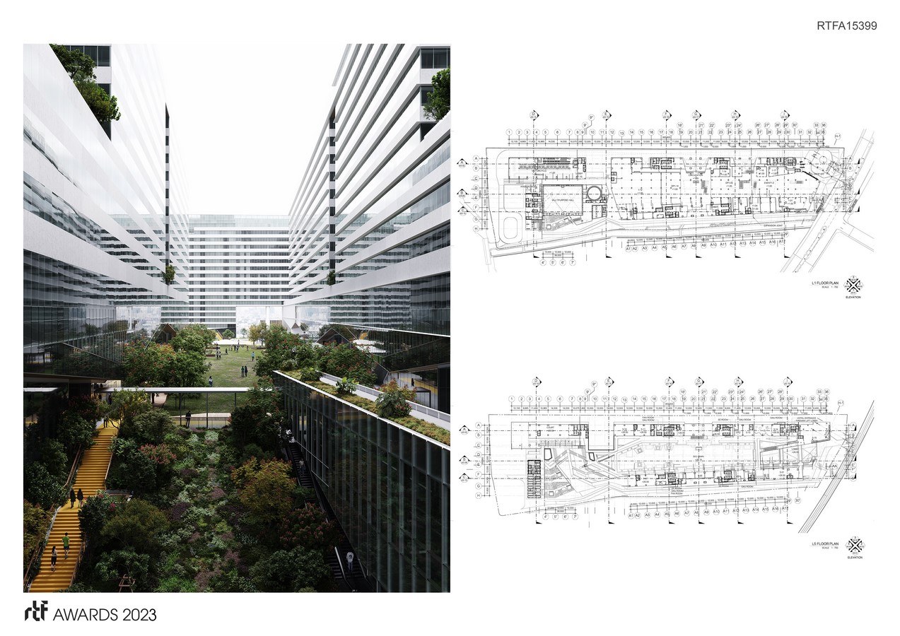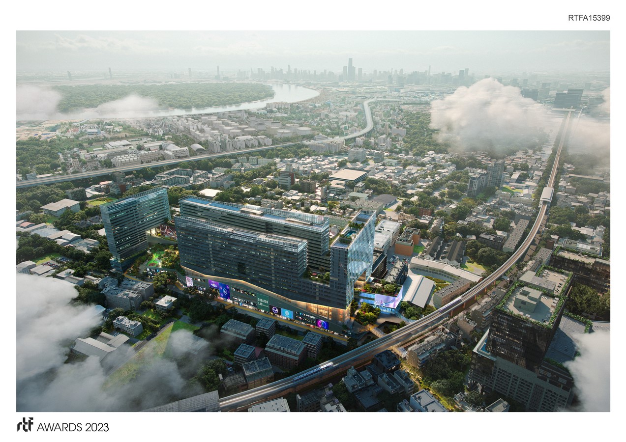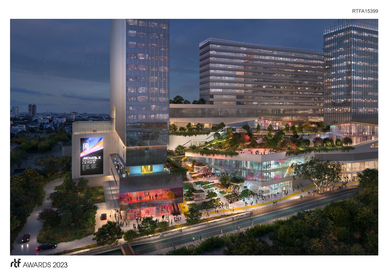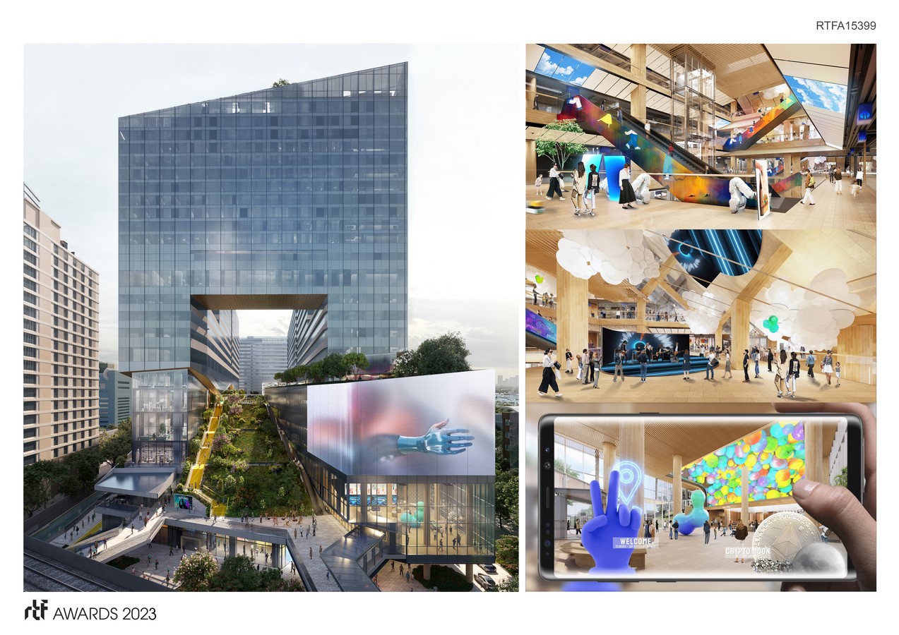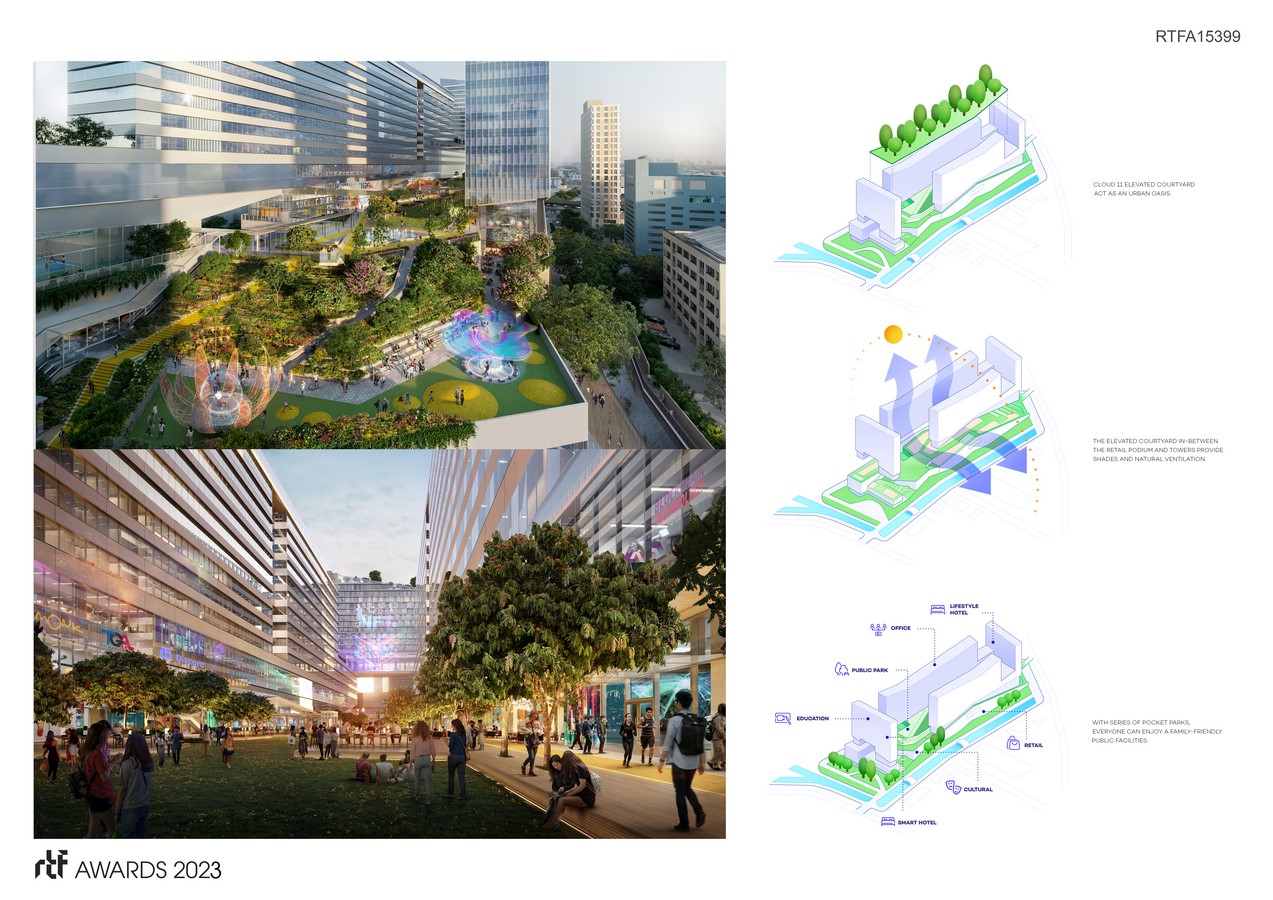 Bringing the entire ecosystem under one roof, Cloud 11 features a creator retail podium, creative workplaces, smart hotels, tech education, and an arena for live performances and e-sports competition. Inspired by its rich surroundings, Cloud 11 stacks three layers of urban contexts –shophouses, elevated paths and the city skyline – creating the captivating “in-between” void. Inherits and interprets the scale, rhythm, profile and skyline.