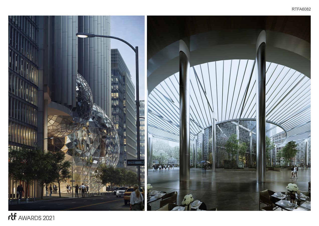 The design for this 1,300,000 square-foot building follows a classic base, middle, and top parti. The base is a study in humane scale. The long western street frontage is bisected by a forty-foot wide passage thru the building and is paired with an iconic lobby taking the form of a sixty-foot sphere emerging from the ground and making its way towards the sky. We celebrate the space between this project and its neighbor with a broad paseo that follows a grand arc, connecting a new south mid-block alley to an eastern midblock alley. This network of spaces is activated by incorporating indoor and outdoor retail, pedestrian-oriented service, and dining spaces into the public realm.