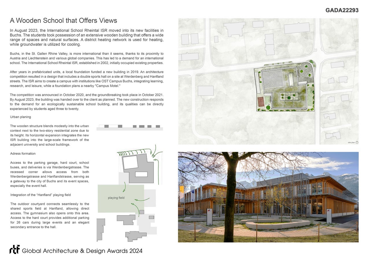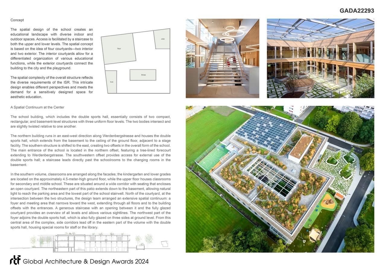 Floor-to-ceiling windows optimize natural light in classrooms, fostering learning and enhancing concentration. The use of regional timber minimizes grey energy and supports the local economy. Overall, the ISR positions itself as a showcase project in the realms of institutional design for compact and flexible school buildings, with facilities such as the sports hall and stage also accessible to community users. It exemplifies sustainable construction utilizing renewable resources, rooftop gardens, biodiversity enhancement, heat reduction strategies, and innovative spatial design through “open learning spaces,” which are not only architecturally appealing but also environmentally friendly and functional.