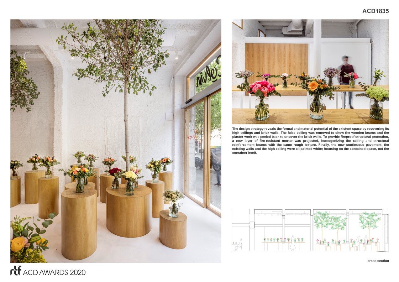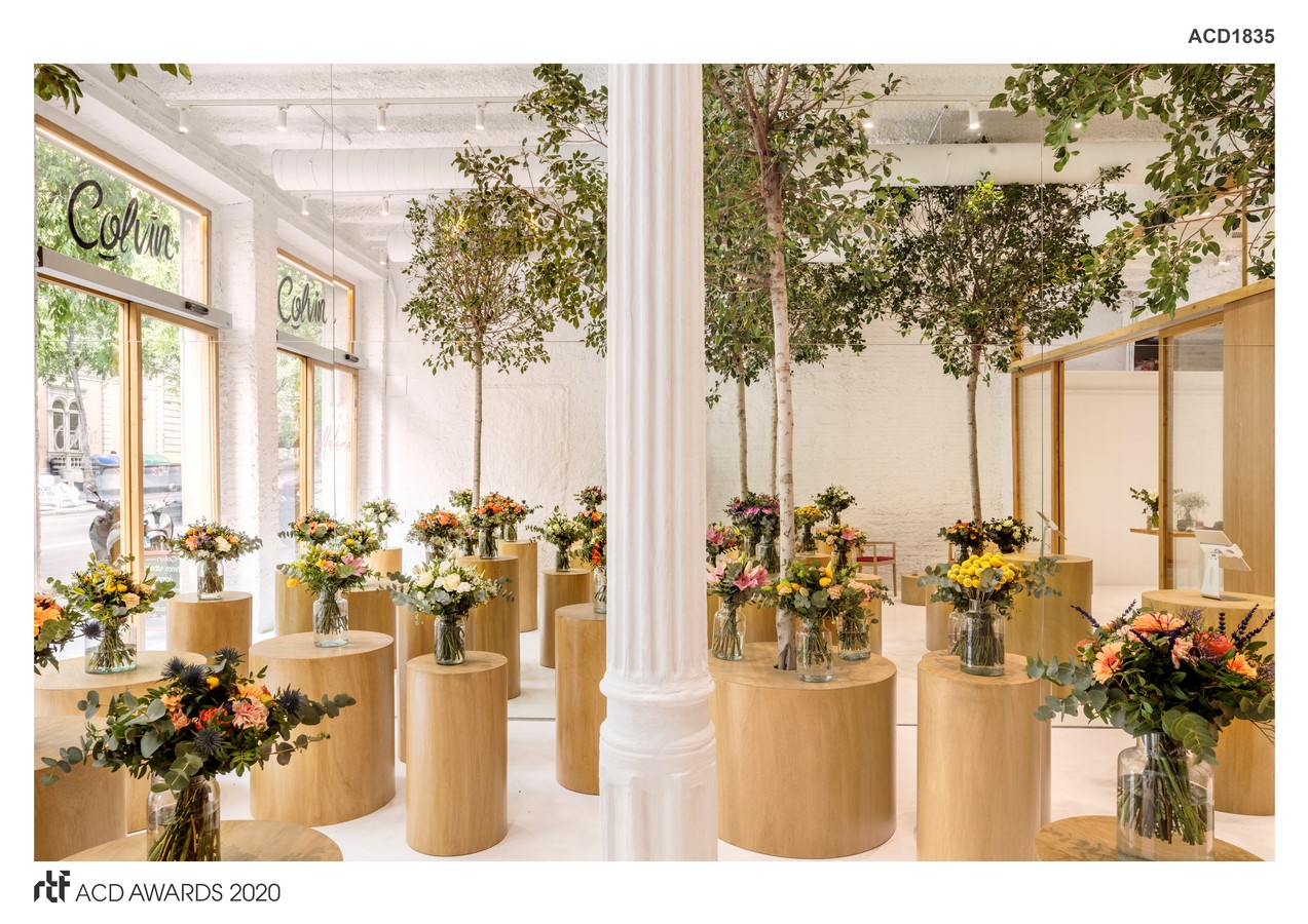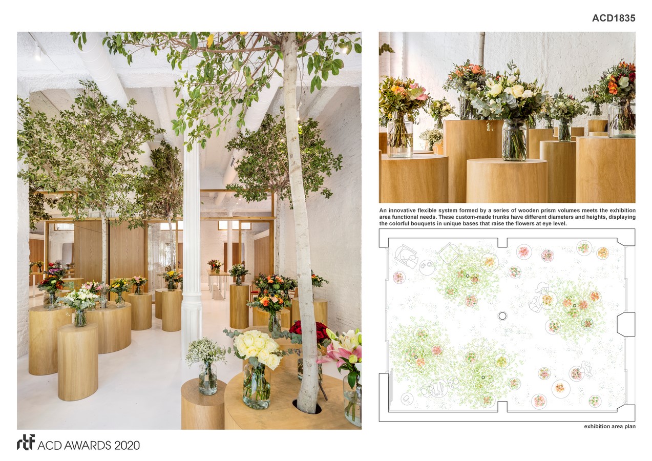 An innovative flexible system formed by a series of wooden prism volumes meets the exhibition area functional needs. These custom-made trunks have different diameters and heights, displaying the colorful bouquets in unique bases that raise the flowers at eye level. Following the same aesthetic concept, wooden prisms also serve as a tea table for the waiting area, a cash desk and tree pots; achieving different functions with the same simple repeated element. These elements, apparently placed at random, completely fill the space in an organic and dynamic way while creating clusters that origin the circulation areas. The aim of the project is inviting each person to find his own way to get lost and interact with flowers by experiencing this new natural environment.