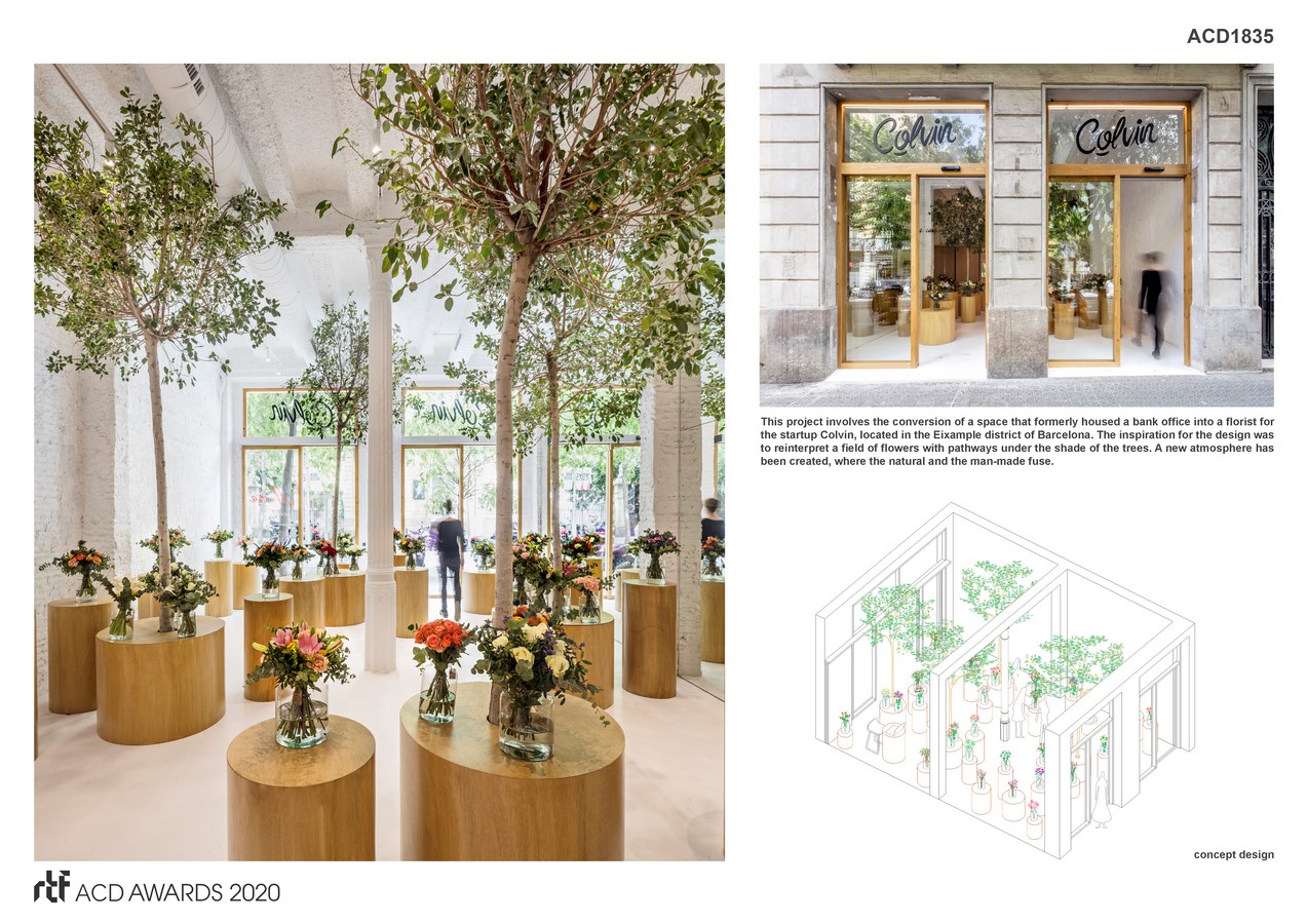 This project involves the conversion of a space that formerly housed a bank office into a florist for the startup Colvin, located in the Eixample district of Barcelona. The inspiration for the design was to reinterpret a field of flowers with pathways under the shade of the trees. A new atmosphere has been created, where the natural and the man-made fuse.
