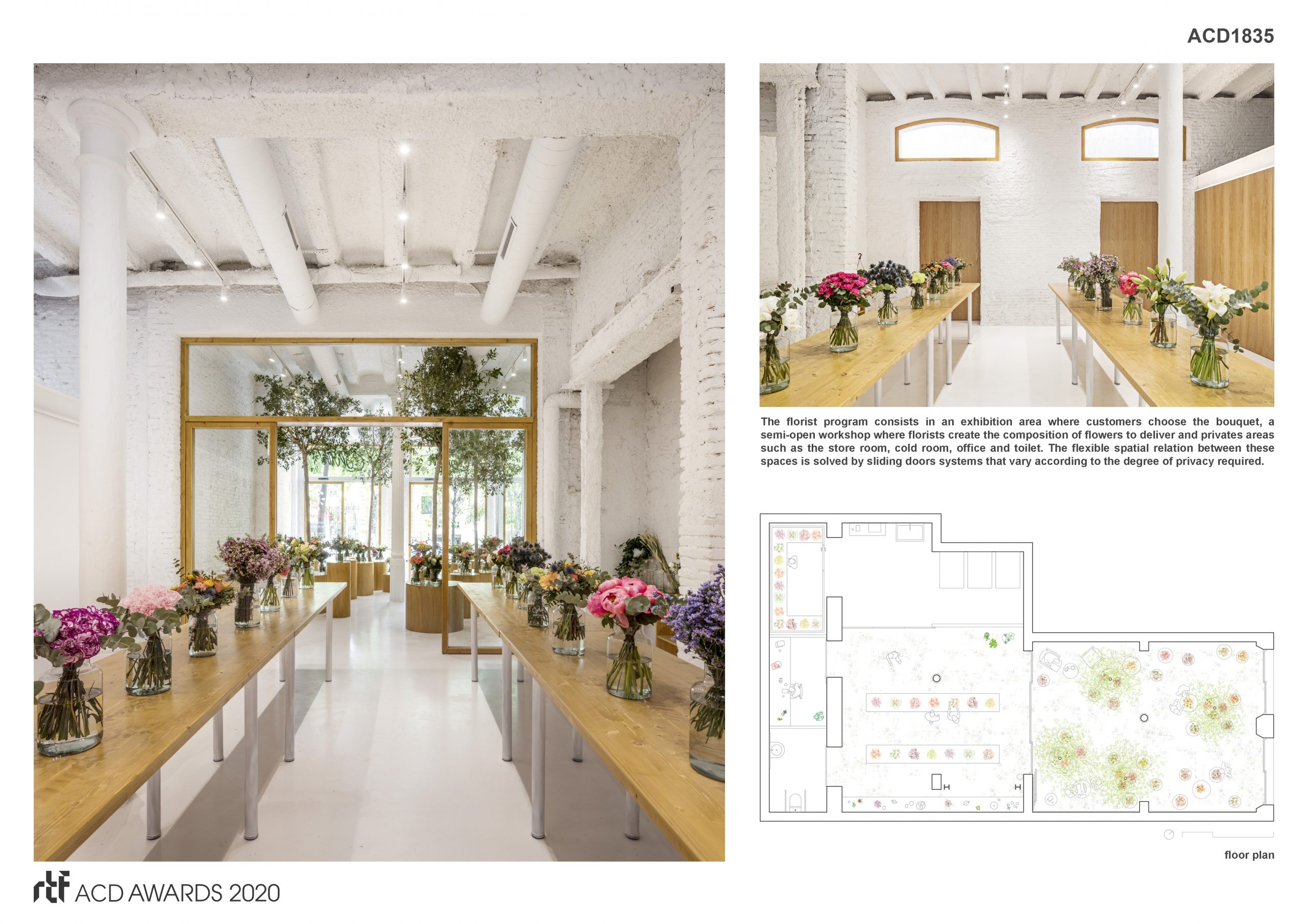 The florist program consists in an exhibition area where customers choose the bouquet, a semi-open workshop where florists create the composition of flowers to deliver and privates areas such as the store room, cold room, office and toilet. The flexible spatial relation between these spaces is solved by sliding doors systems that vary according to the degree of privacy required. The combination of fixed and mobile glass doors with wooden frames, together with the sliding oak doors, allows users to visually or acoustically separate the activities from the street to private rooms.