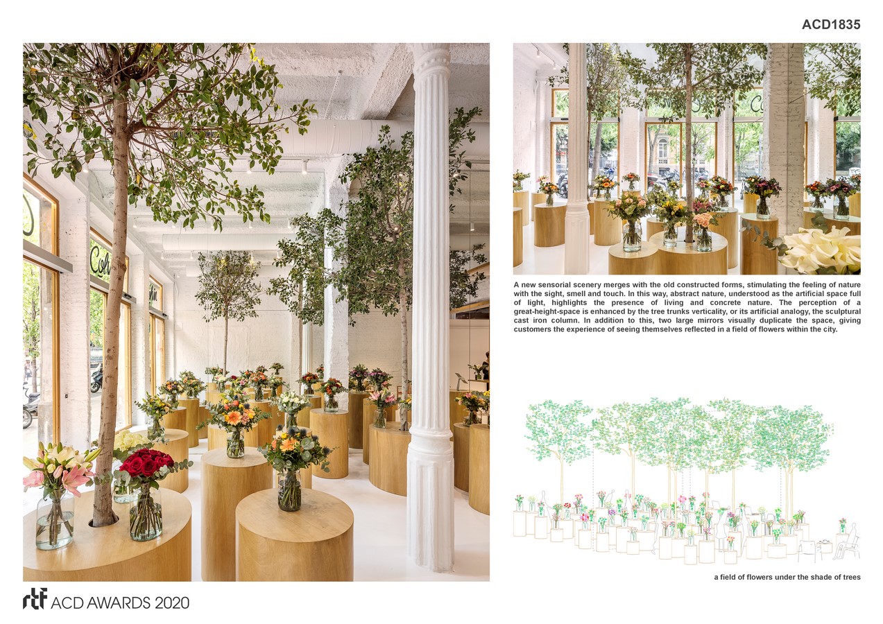 The second intervention was creating a new form of environment that encourages people to explore flowers in a natural topography. A new sensorial scenery merges with the old constructed forms, stimulating the feeling of nature with the sight, smell and touch. In this way, abstract nature, understood as the artificial space full of light, highlights the presence of living and concrete nature. The perception of a great-height-space is enhanced by the tree trunks verticality, or its artificial analogy, the sculptural cast iron column. In addition to this, two large mirrors visually duplicate the space, giving customers the experience of seeing themselves reflected in a field of flowers within the city.