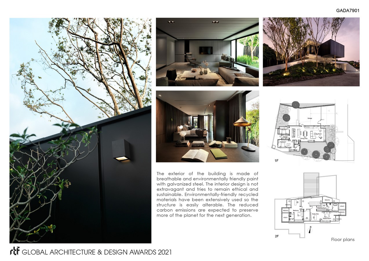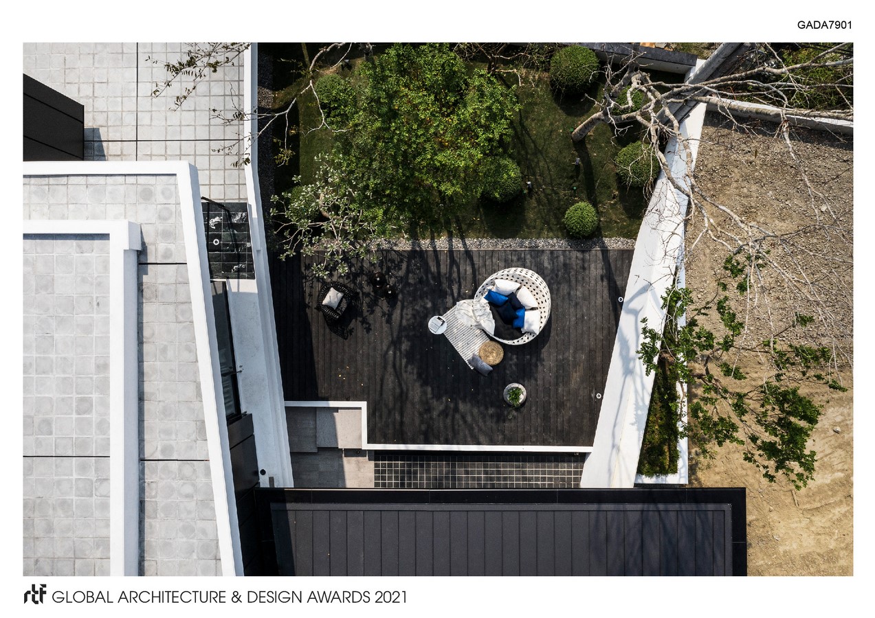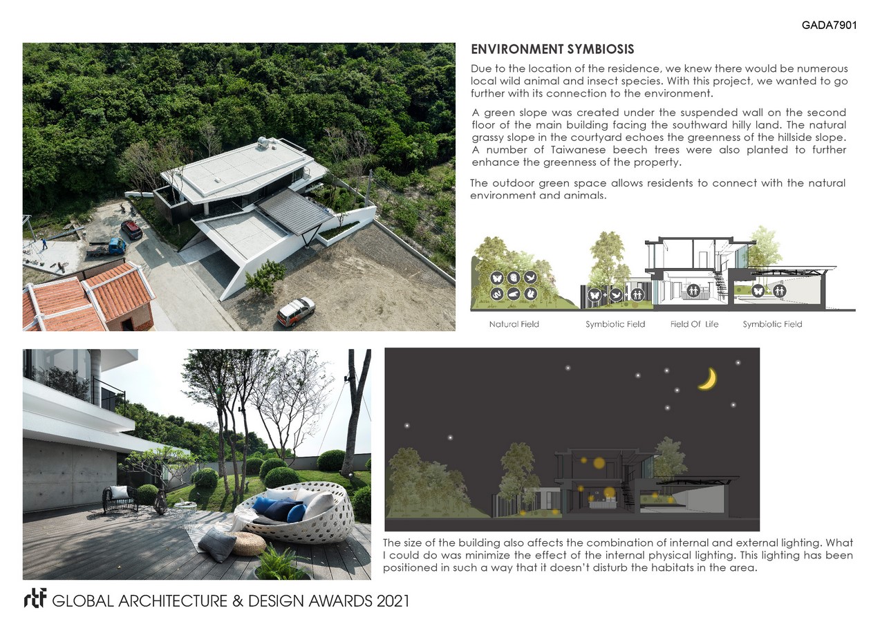 In front of the property, there is a private 6 meter road that takes into account privacy and the safety of vehicles entering and exiting. The building is 6.5 meters away from the road. A green slope was created under the suspended wall on the second floor of the main building facing the southward hilly land. The natural grassy slope in the courtyard echoes the greenness of the hillside slope.