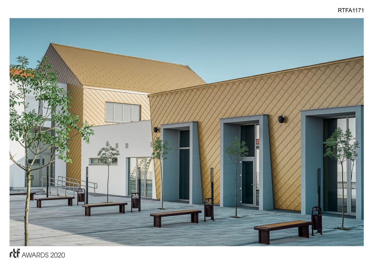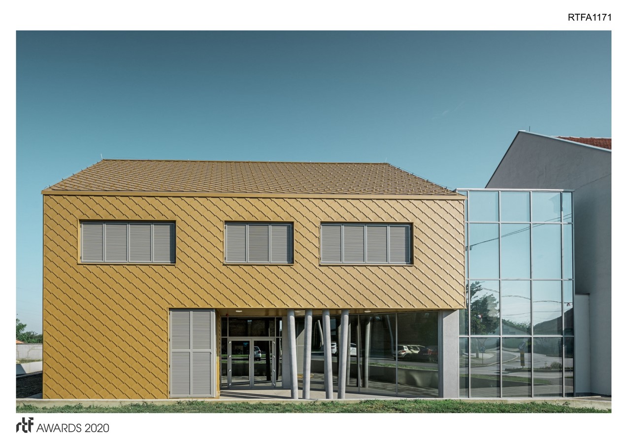 Respecting the context, the shape of the building was designed to adapt to the street silhouette. At the back, the volume of the hall was shaped to merge with open public space. What makes the building contemporary and different is romb shaped skin which like glimmering shells envelops the facade.