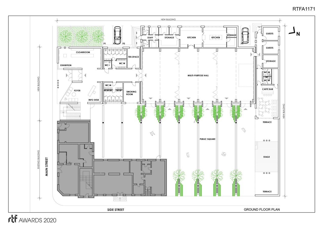 Functionally, at the main street, there is enter to the lobby. Communications lead to offices and administration on the first floor or to the multi-purpose hall on the ground floor. Hall is connected to the public square through great glassed openings. Square, public space, is ending with a covered stage for different events at open.