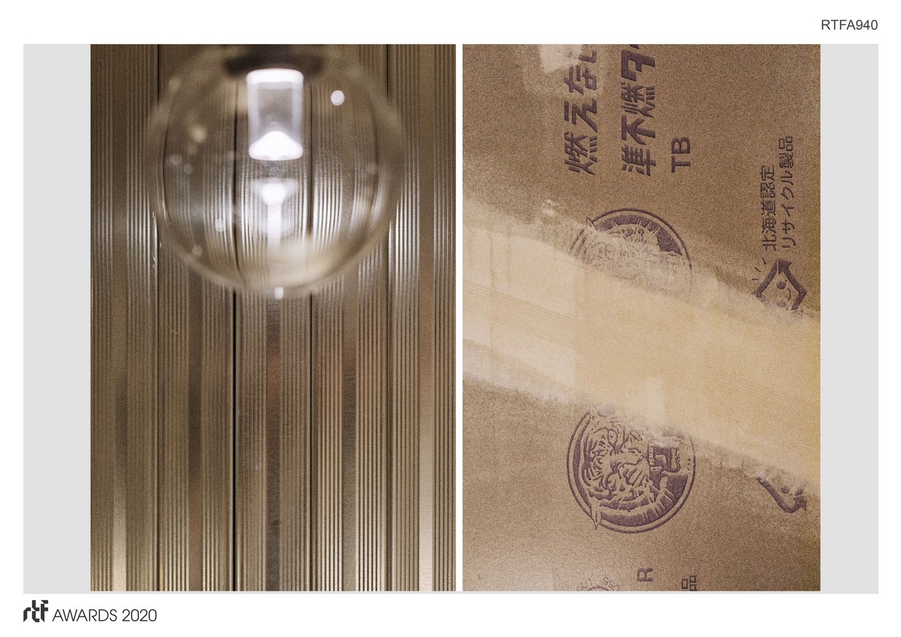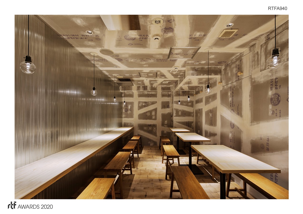 Additionally, the existing plasterboard was peeled off and the studs, as the base materials, were lined out and used as a fine finishing material. Moreover, we used an existing flooring as the main floor texture and the desks were spread out throughout the space and blanked with thinned wooden chopsticks.