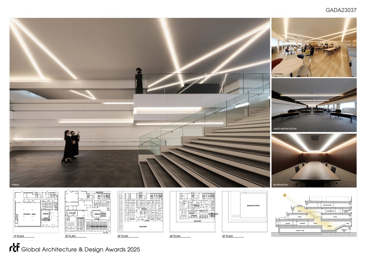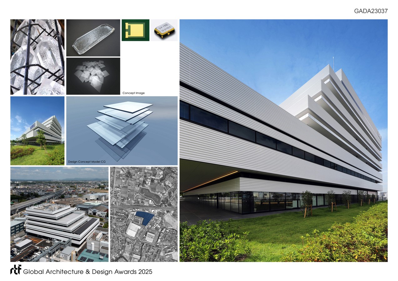 DAISHINKU CORP. is a leading Japanese company engaged in the manufacturing and sales of quartz devices. This project aims to create a smart factory that integrates headquarters and plant functions on a site adjacent to the existing Central Laboratory. The exterior design is inspired by stacked crystal chips. Five layered rectangular volumes of different sizes represent DAISHINKU’s history of technological innovation and its future growth.