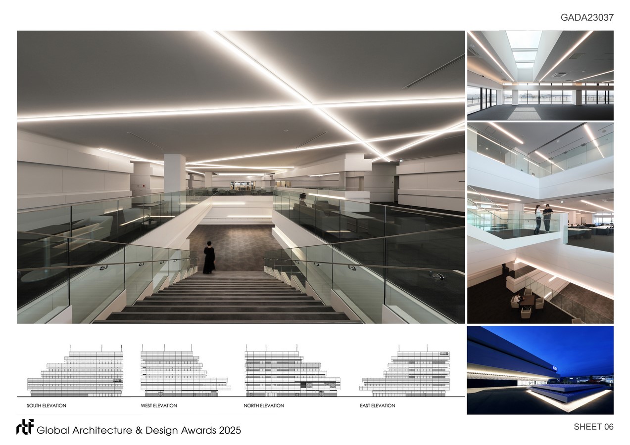 Additionally, the stacked volumes are designed to rise gradually, expressing the company’s technological evolution and growth in an upward trajectory, creating an impressive design full of dynamism.