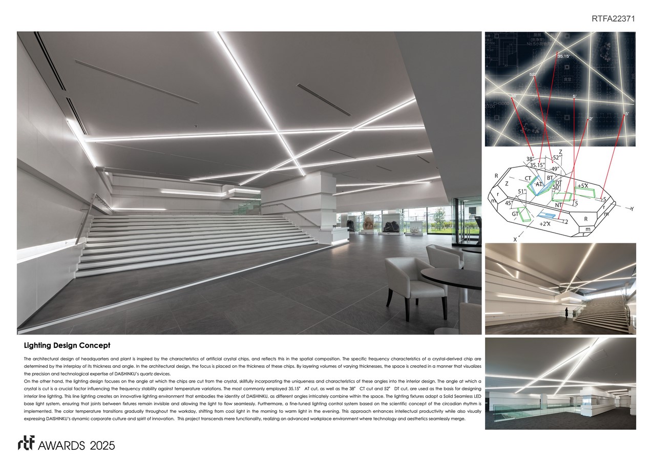 The interior lighting is designed with a focus on the angles of the chips cut from crystal. The thickness of the processed chips is a key factor in determining the device’s resonance frequency, while the angle is an element that affects the stability of that frequency. The most commonly employed 35.15°AT cut, as well as the 38°CT cut and 52°DT cut, is used to design interior line lighting based on these unique angles. This line lighting creates an innovative lighting environment that embodies DAISHINKU’s identity, as different angles intricately combine within the space.