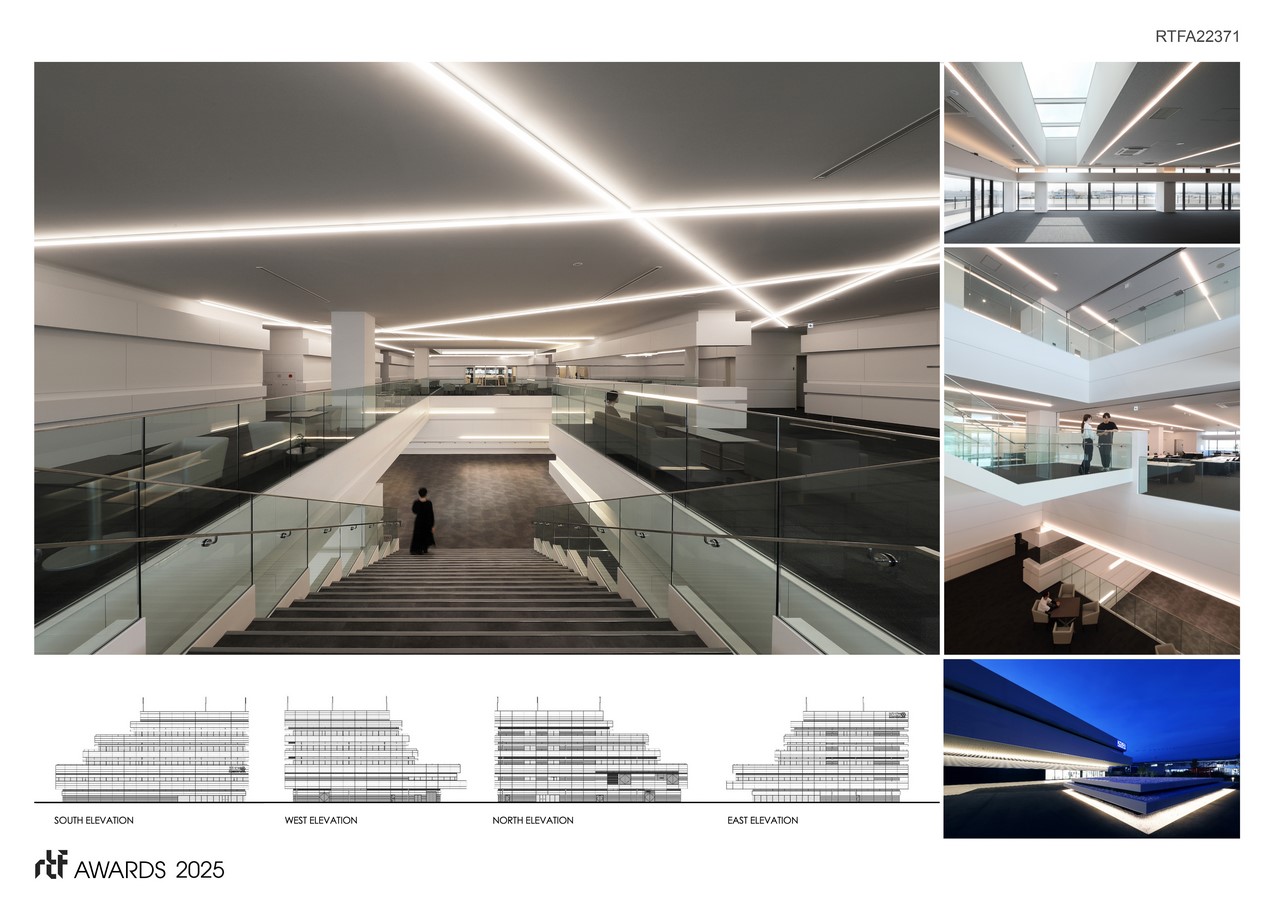 Additionally, the stacked volumes are designed to rise gradually, expressing the company’s technological evolution and growth in an upward trajectory, creating an impressive design full of dynamism.