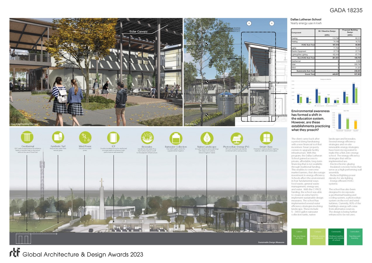 The client came back after a period doing fundraising with a new financial tool that incentives sustainable design measures. With the C-PACE funding, the school was able to implement several strategies. These include rainwater collection tanks, native landscape and bioswales. Several energy efficiency strategies and on-site renewable energy strategies have been incorporated to make this a Net-Zero energy school. Some of them are electrochromic glazing, high performing wall assembly and energy efficient HVAC systems. Currently, 80% of the building’s energy will come from alternative sources. The design is being further enhanced to be net-zero.